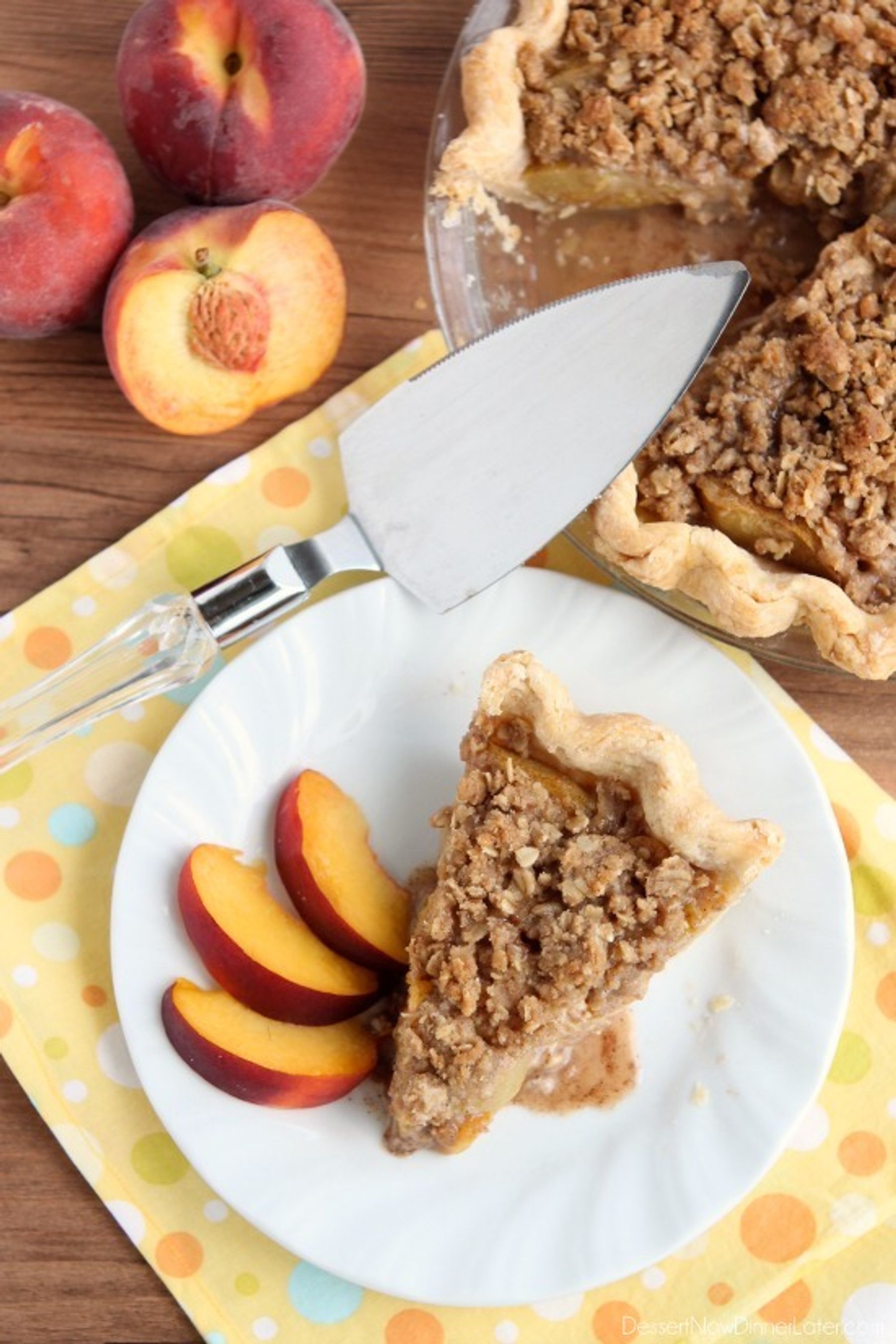 This peach pie can be made with fresh or frozen fruit, has a hint of cinnamon, and a crunchy streusel on top!