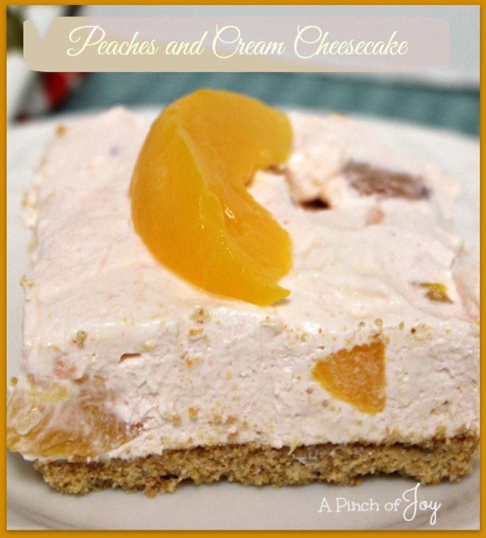 A light and cool ending for a summer meal or a not too sweet dessert for a gathering or a dessert bar, this no bake cheesecake is all Peaches and Cream!