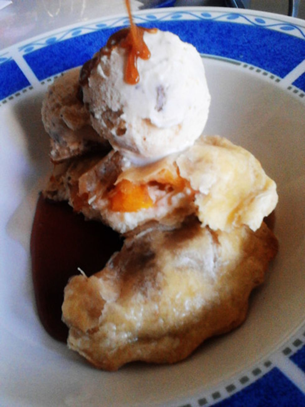 Peaches & Cream Raviolo with Brown Butter Whiskey Caramel Sauce