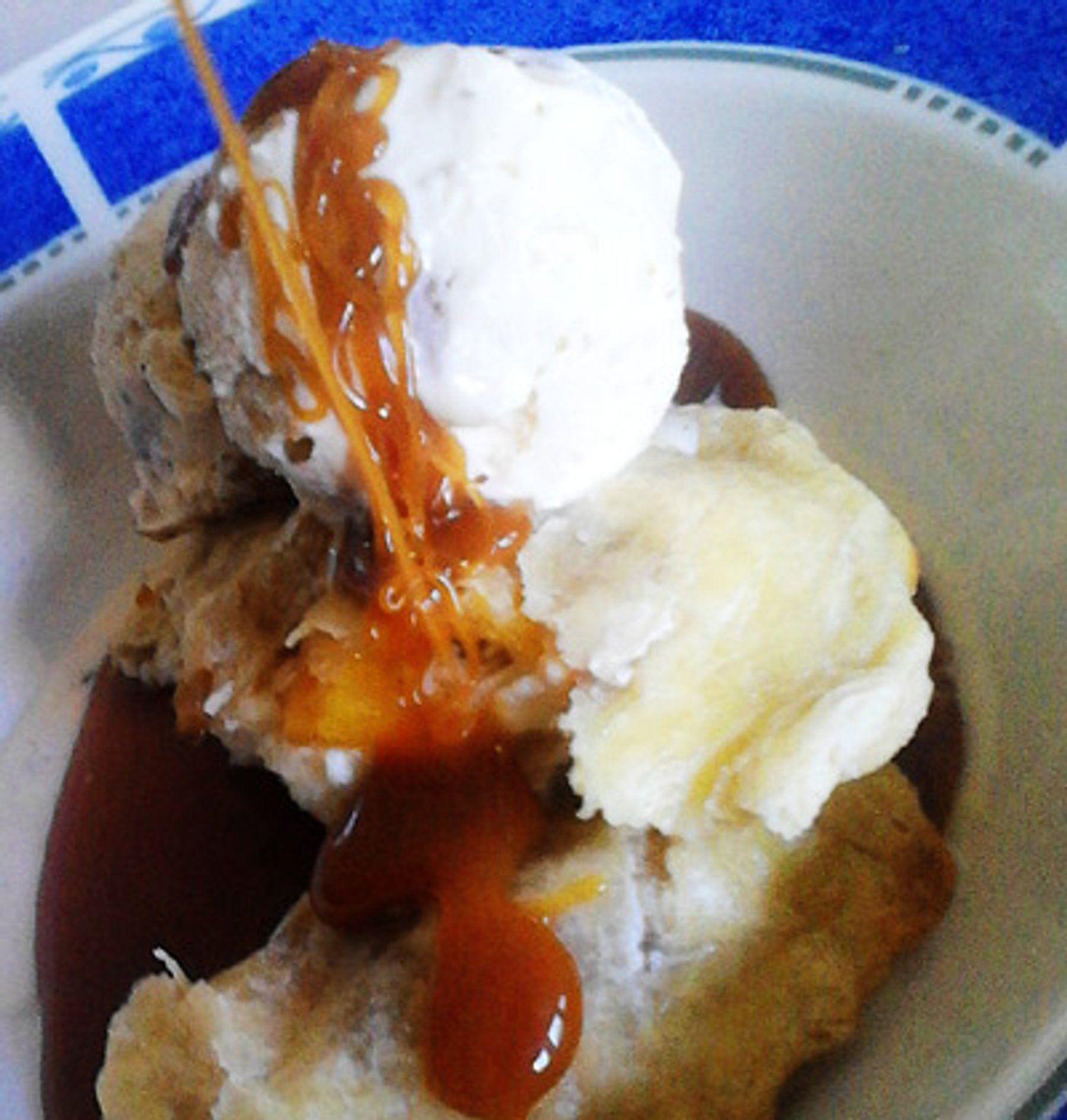 Pool some of the warm sauce onto the bottom of serving bowls. Place a raviolo on top, and top with vanilla or buttered pecan ice cream. Pour on additional sauce.