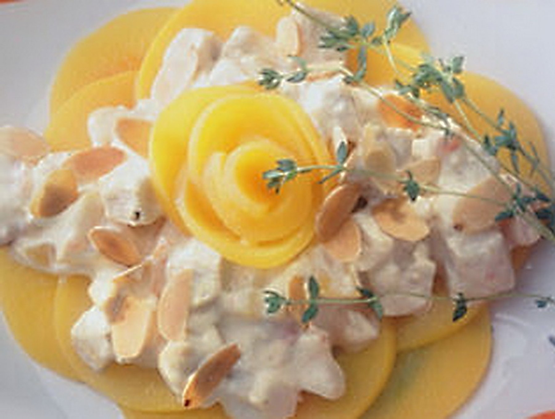 In a large bowl, combine 1/3 cup mayonnaise, 2 tablespoons milk, salt and pepper 1/4 teaspoon dried tarragon and blend well. Add chicken and toss to coat. Stir in grapes, peas, peaches and pecans. Decorate...