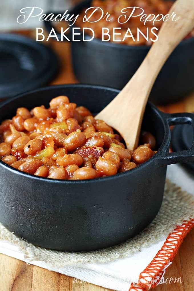 Peachy Dr Pepper Baked Beans: Baked beans are combined with Dr Pepper, peach preserves and fresh diced peaches