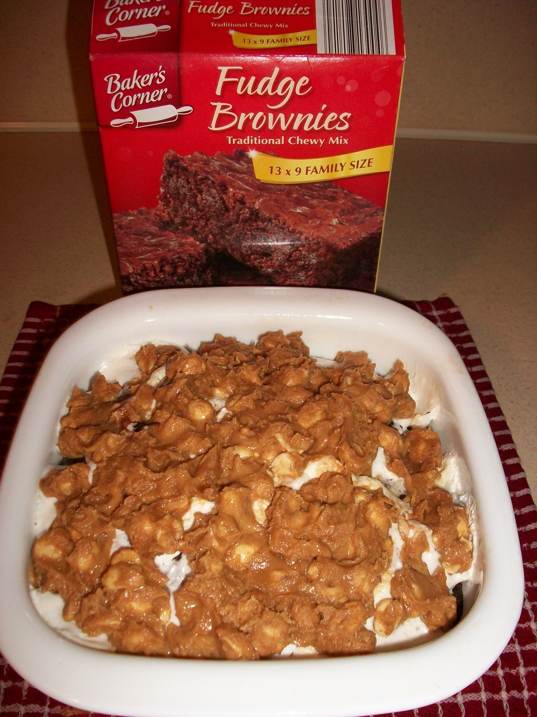 Mix brownie mix, applesauce 1/3rd cup water, and eggs. Then pour into an 8x8 greased pan and bake for the amount of time listed on brownie mix box (the kind I used said 40 minutes to make a very thick brownie). While the brownie is baking, mix peanuts, peanut butter, 1 tablespoon water, and 1 tablespoon brown sugar in a microwaveable bowl. Microwave for 1 minute. When brownie is baked, add marshmallows to top and bake 2 minutes longer or until marshmallows are melted. Then top with the peanut mixture . Refridgerate for atleast an hour before serving.