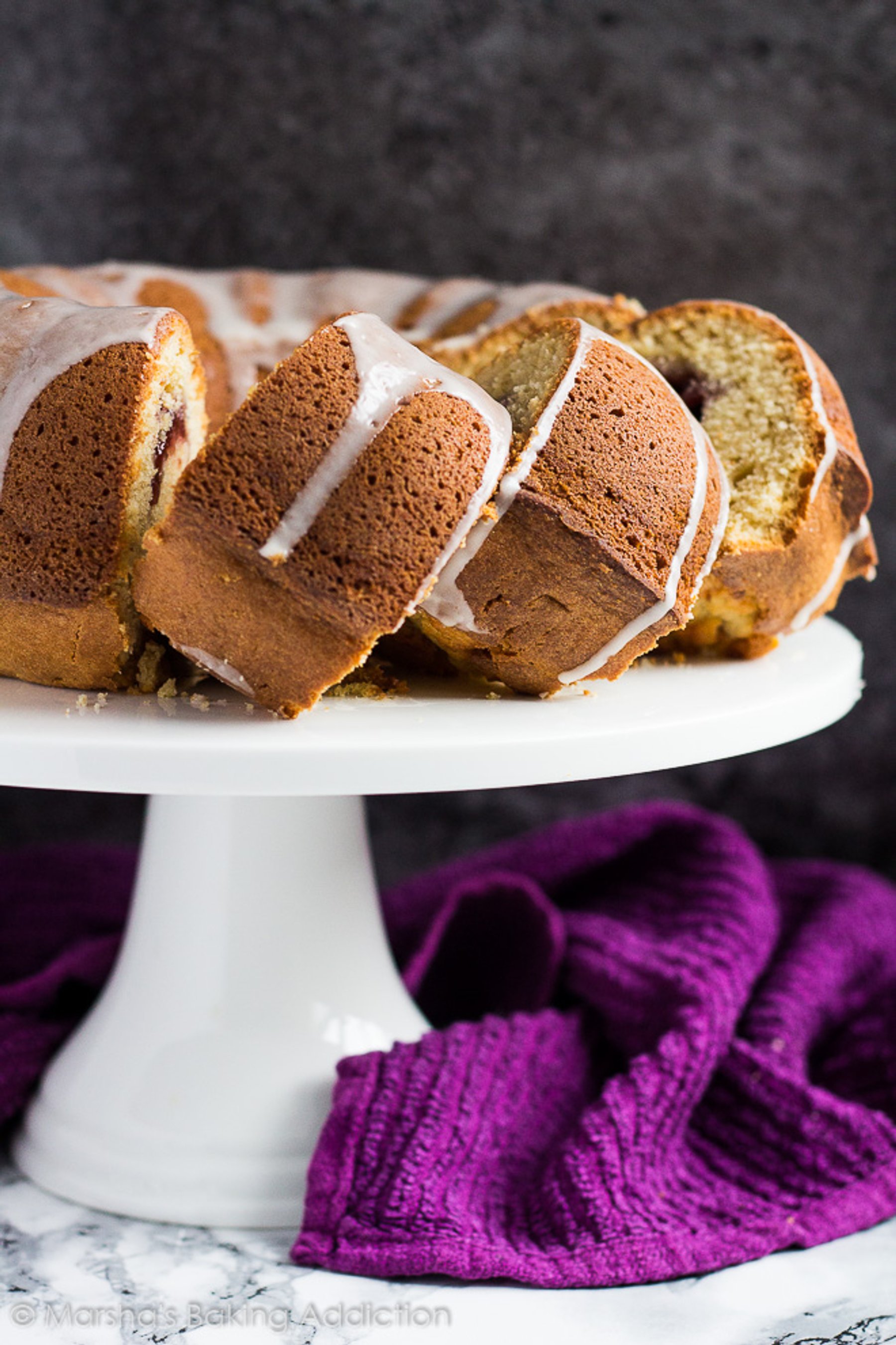 A scrumptiously moist and fluffy peanut butter flavoured bundt cake swirled with a strawberry jam filling!