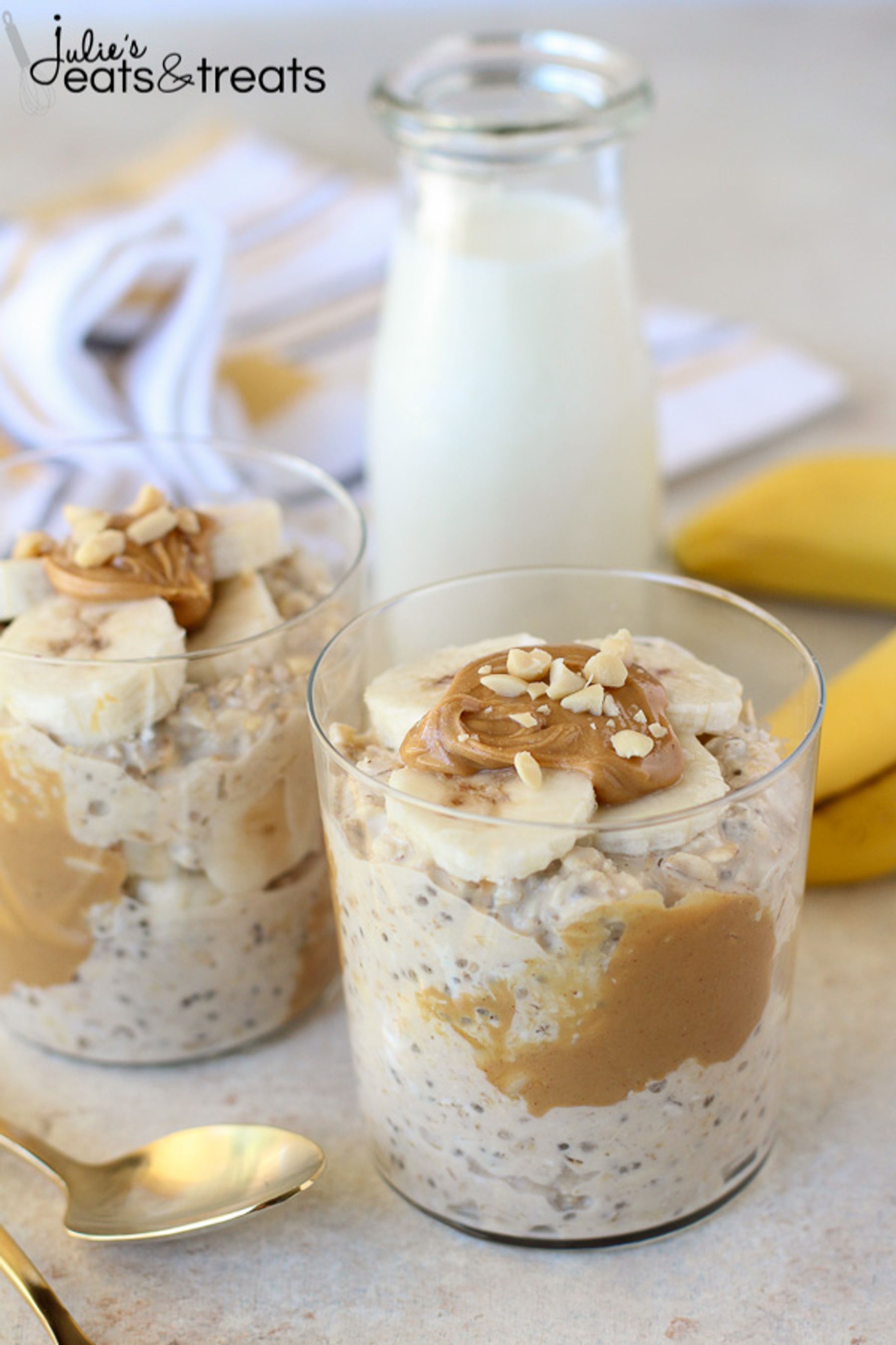 In a large bowl combine milk, chia seeds, syrup and 2 tablespoons peanut butter. Stir in oats. Cover and refrigerate (or transfer to individual bowls/glasses/jars). Refrigerate overnight, until the oats are...