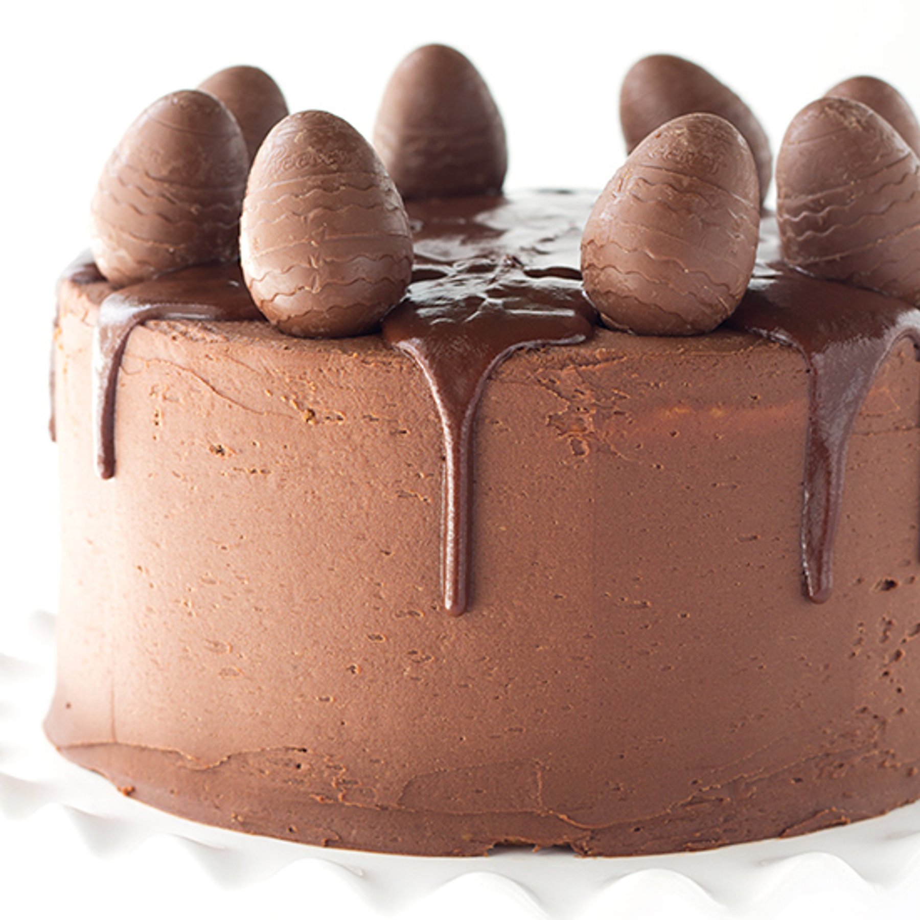 Peanut Butter Cake with Chocolate Frosting - peanut butter cake filled with chocolate frosting and chopped peanut butter cups. Top this cake with a chocolate peanut butter ganache and cute peanut butter filled chocolate eggs for EASTER!