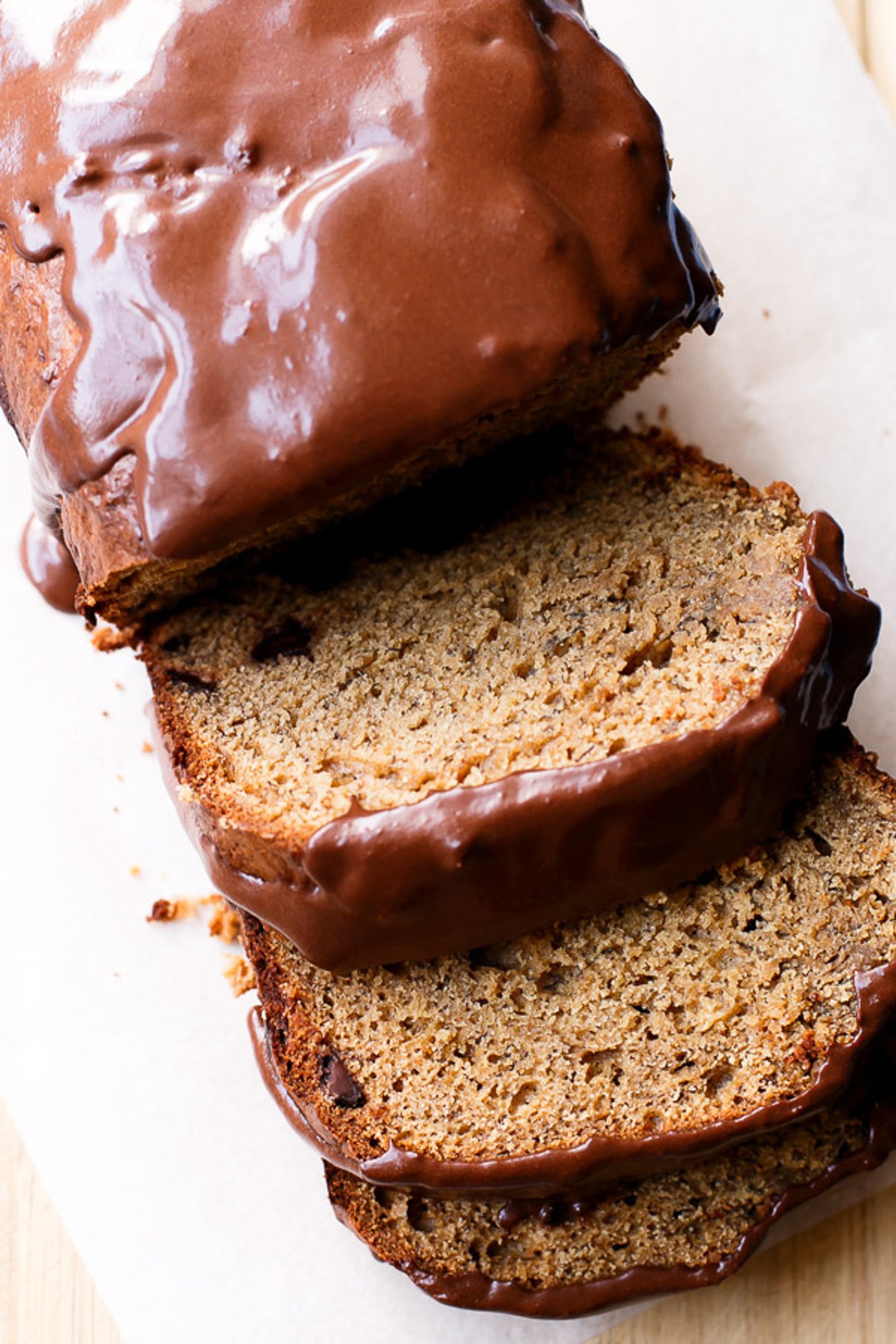 The perfect addition to fluffy and sweet Banana Bread would have to be peanut butter and chocolate chips. With a chocolate peanut butter topping, you’ll be reaching for more than three slices. And you can. Because this has half the fat than regular cakes