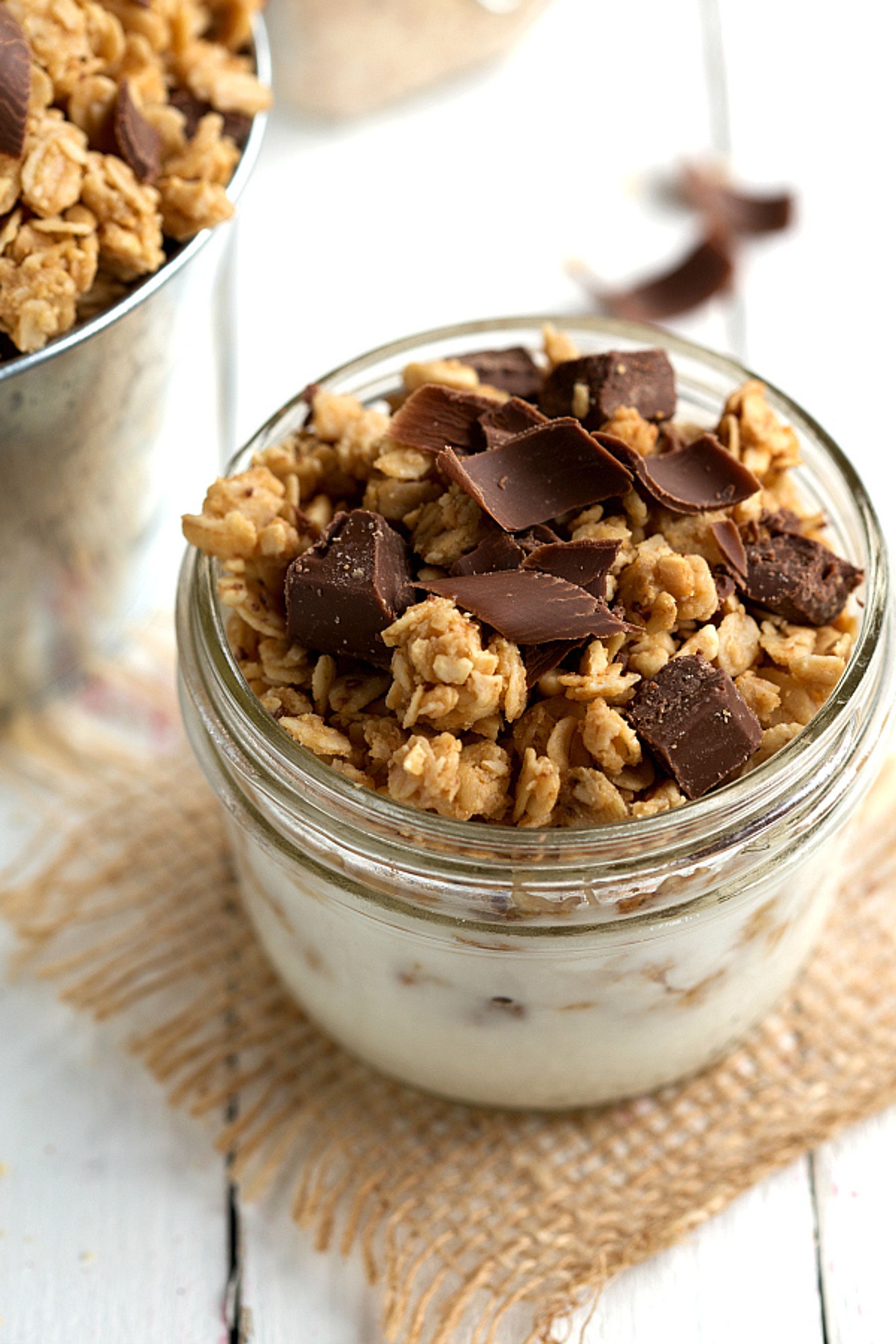 The tastiest peanut butter cup granola mixed into a creamy and delicious yogurt parfait. A healthy and flavorful breakfast that can easily be taken on-the-go.