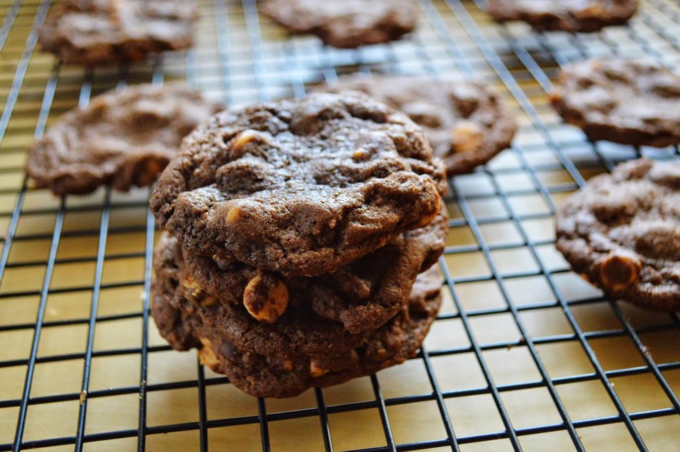 Peanut butter chips and chocolate chips all throughout this chocolate cookie! Crispy on the outside and gooey in the middle, so yummy!