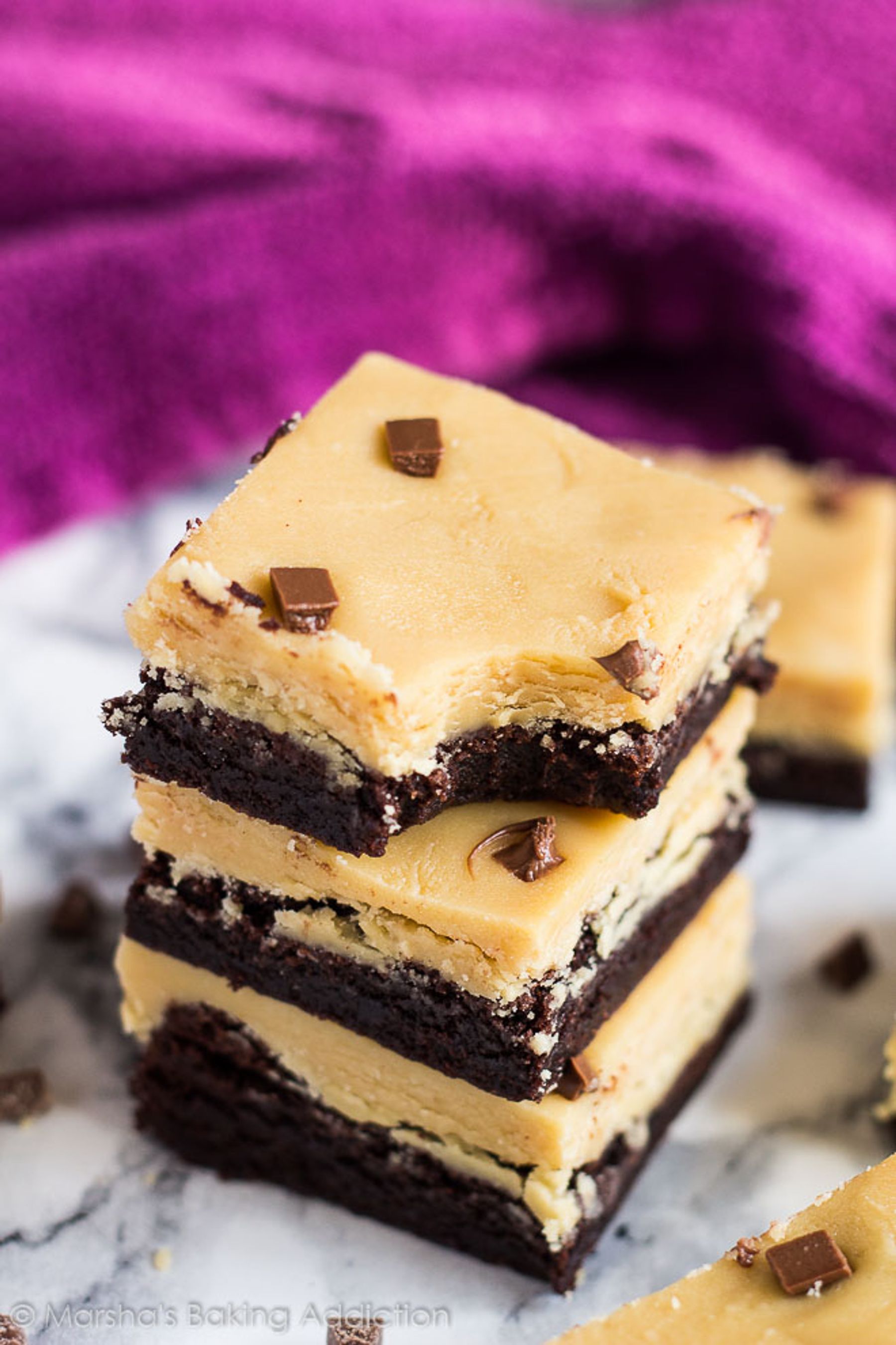 Deliciously thick and chewy rich chocolate brownies that are topped with a thick layer of creamy peanut butter fudge!