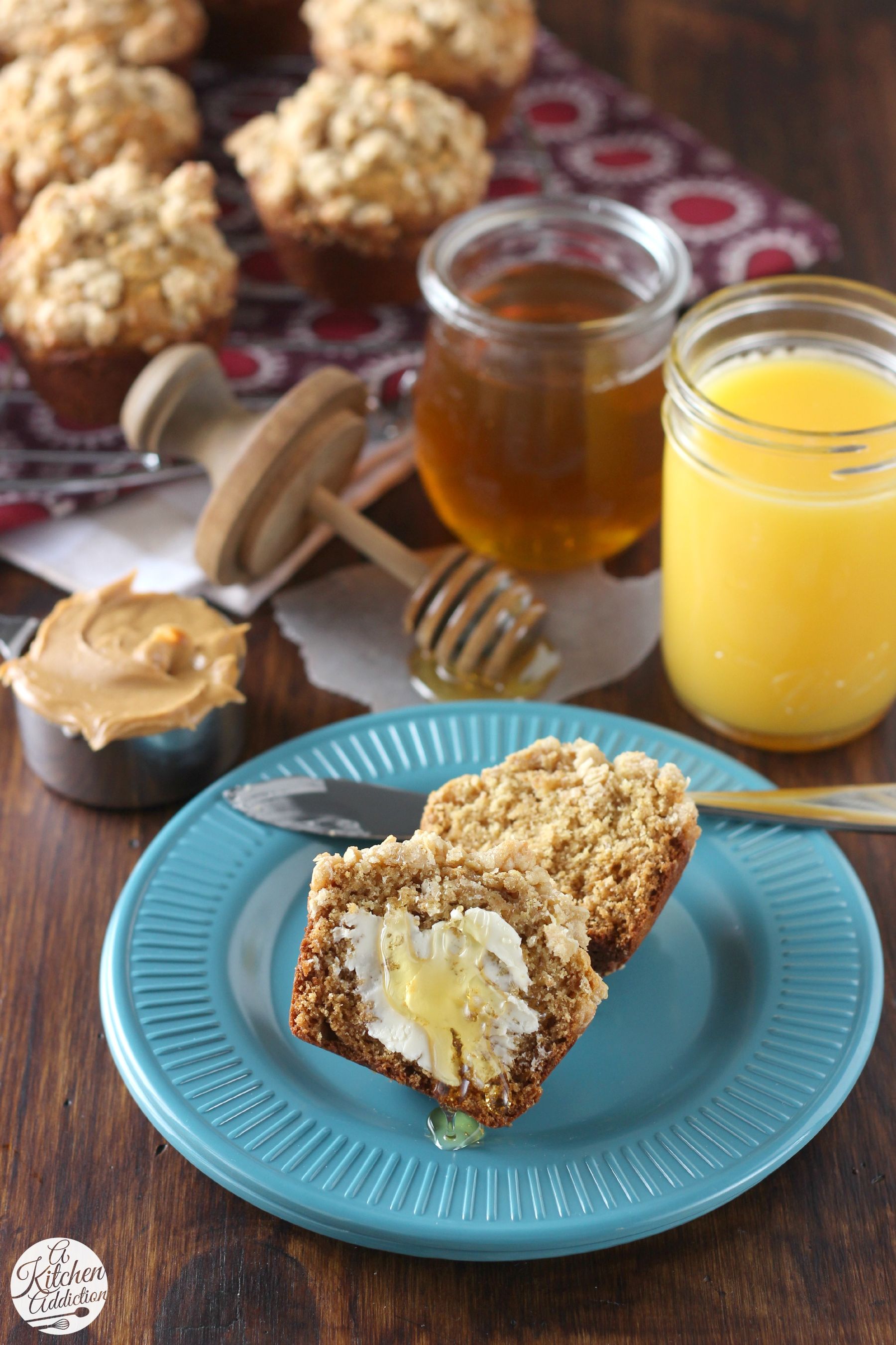 Hearty peanut butter muffins topped with a buttery oat crumble!