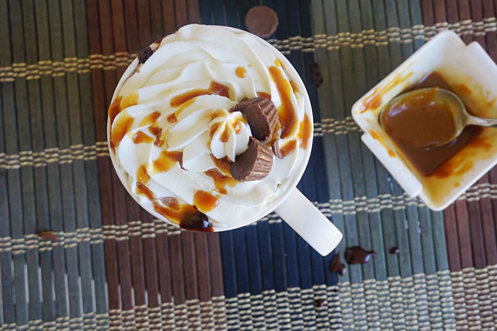 Rich,luscious peanut butter hot chocolate,topped with smooth creamy whipped cream and drizzled with some extra peanut butter. Trust me,it’s not overwhelming. Is that rich enough? I hope you can’t get enough of it!