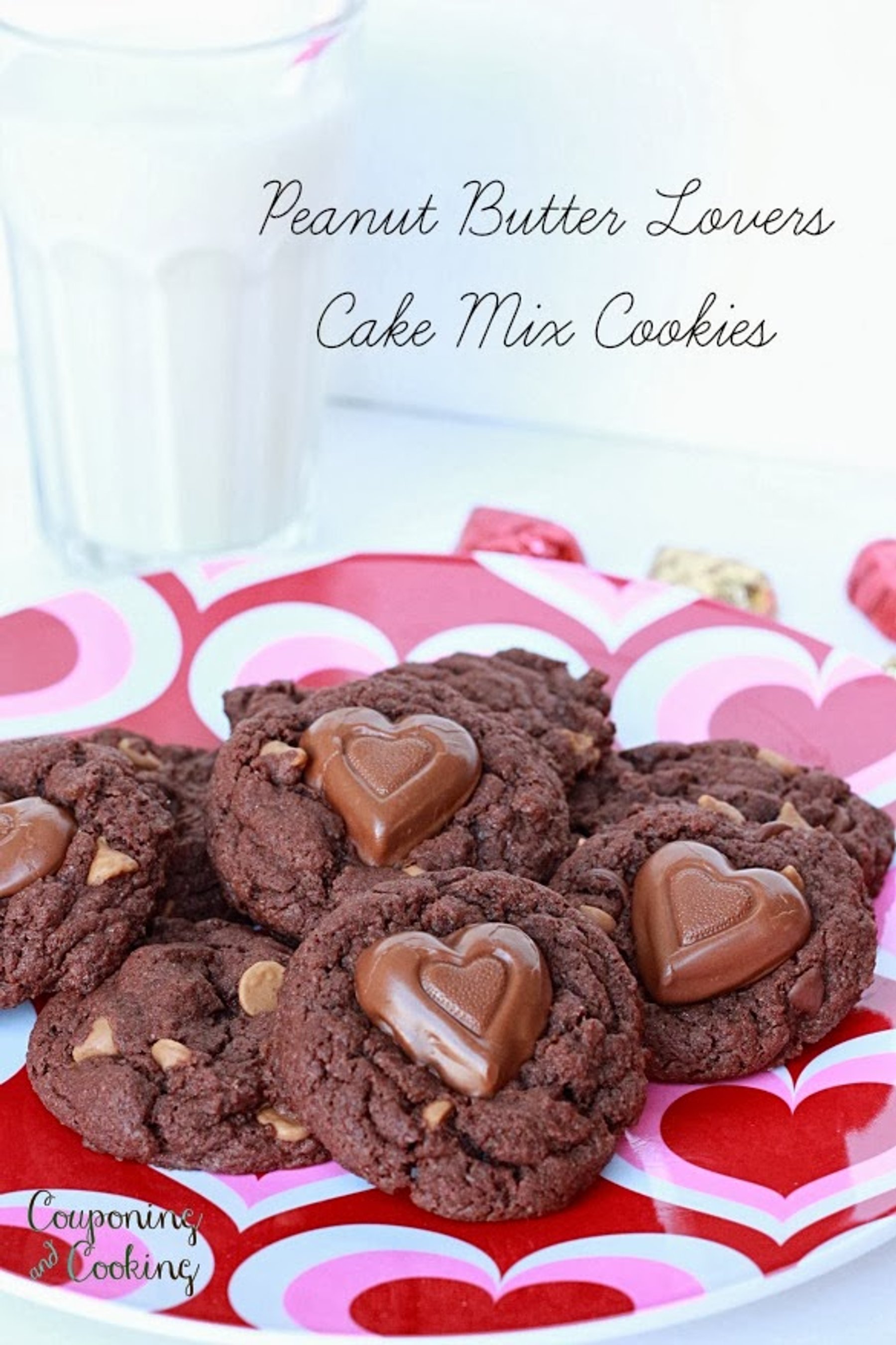 A traditional cake mix cookie base using Devil's Food cake mix, add in some peanut butter chips and top with a melty Reese's heart !