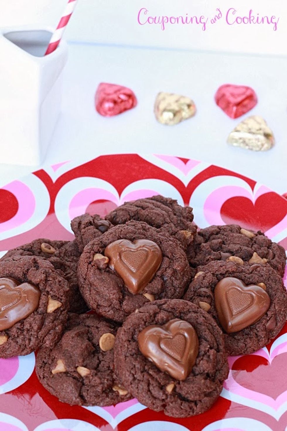 A traditional cake mix cookie base using Devil's Food cake mix, add in some peanut butter chips and top with a melty Reese's heart !