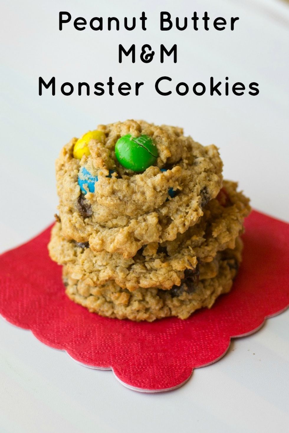 Peanut Butter M&M Monster Cookies are full of peanut butter, oatmeal, M&M's, chocolate chips and....no flour! That makes them healthy, right? :)