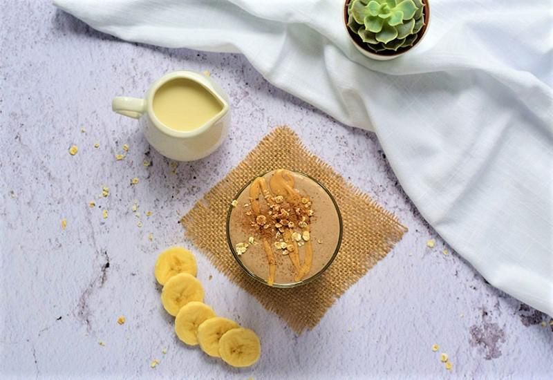 - Pour everything into a jar or a glass. Garnish with some peanut butter, cinnamon, and quick oats.