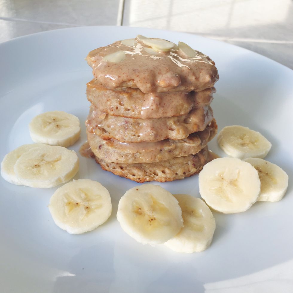 Peanut butter pancakes. Super fluffy and light, served with melted peanut butter. Vegan + Gluten Free.