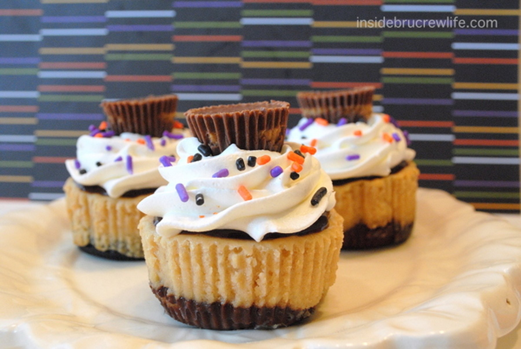 Peanut butter cheesecakes loaded with Peanut Butter Cups inside and on top