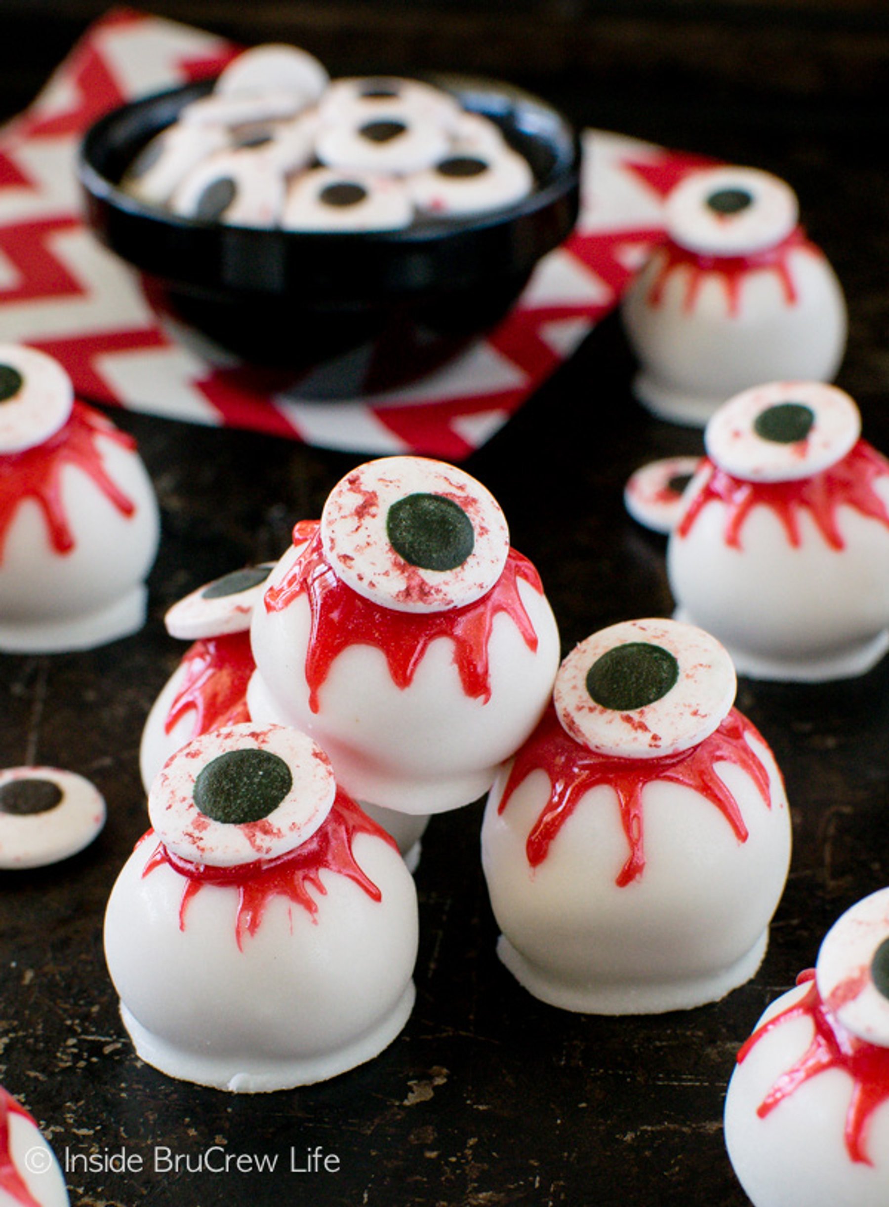Visit my website for the full directions: http://insidebrucrewlife.com/2016/10/peanut-butter-zombie-eyeballs/