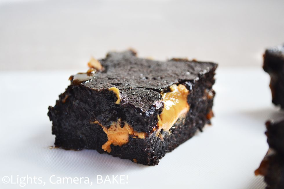 Rich and fudgy cocoa brownies filled with pockets of peanut butter and swirled with homemade caramel sauce.