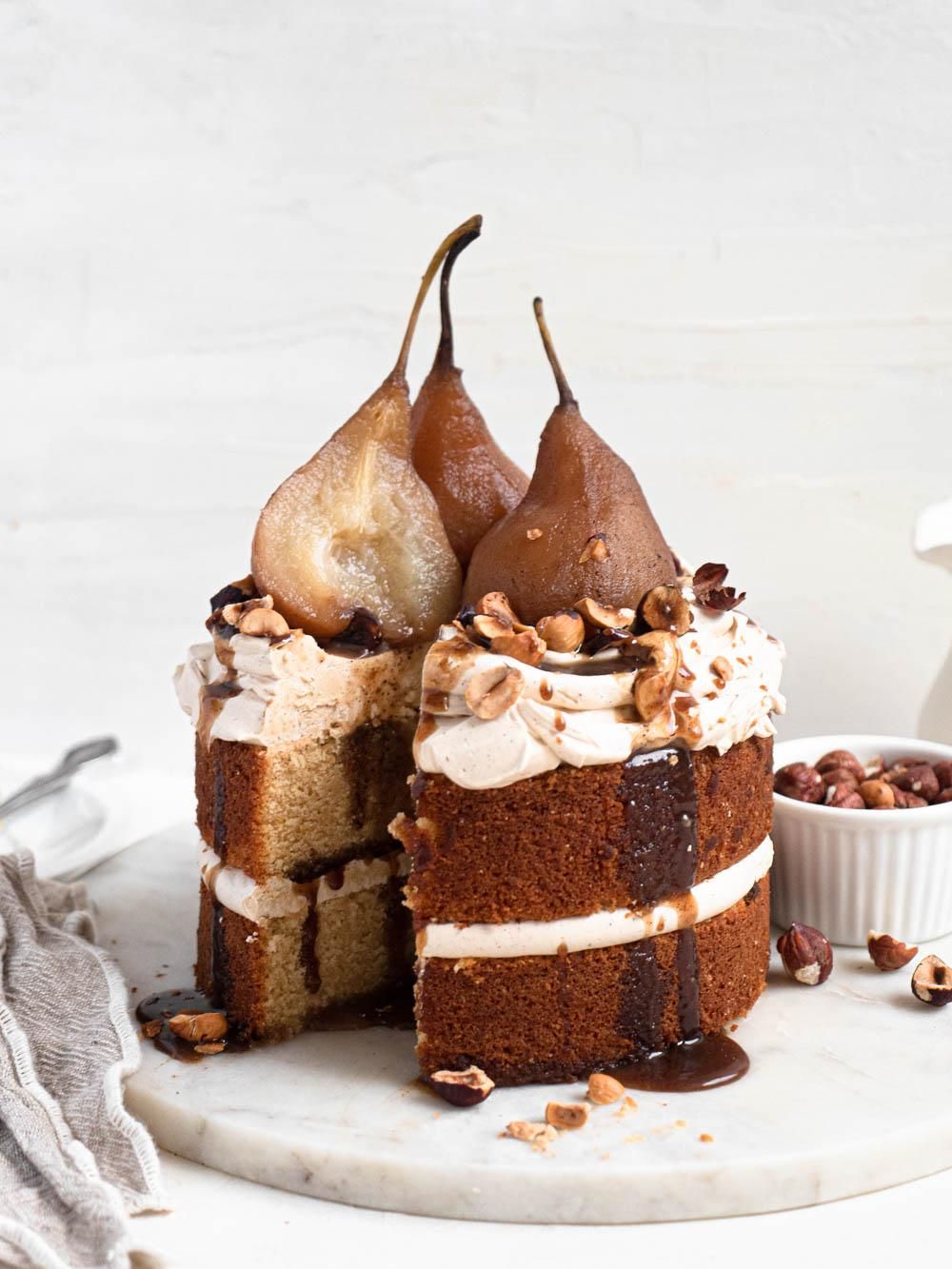 Moist and fluffy brown sugar butter cake layers with spiced caramel, caramel buttercream, roasted hazelnuts and tender poached pears. A warm, cozy and stunning pear and caramel layered cake.