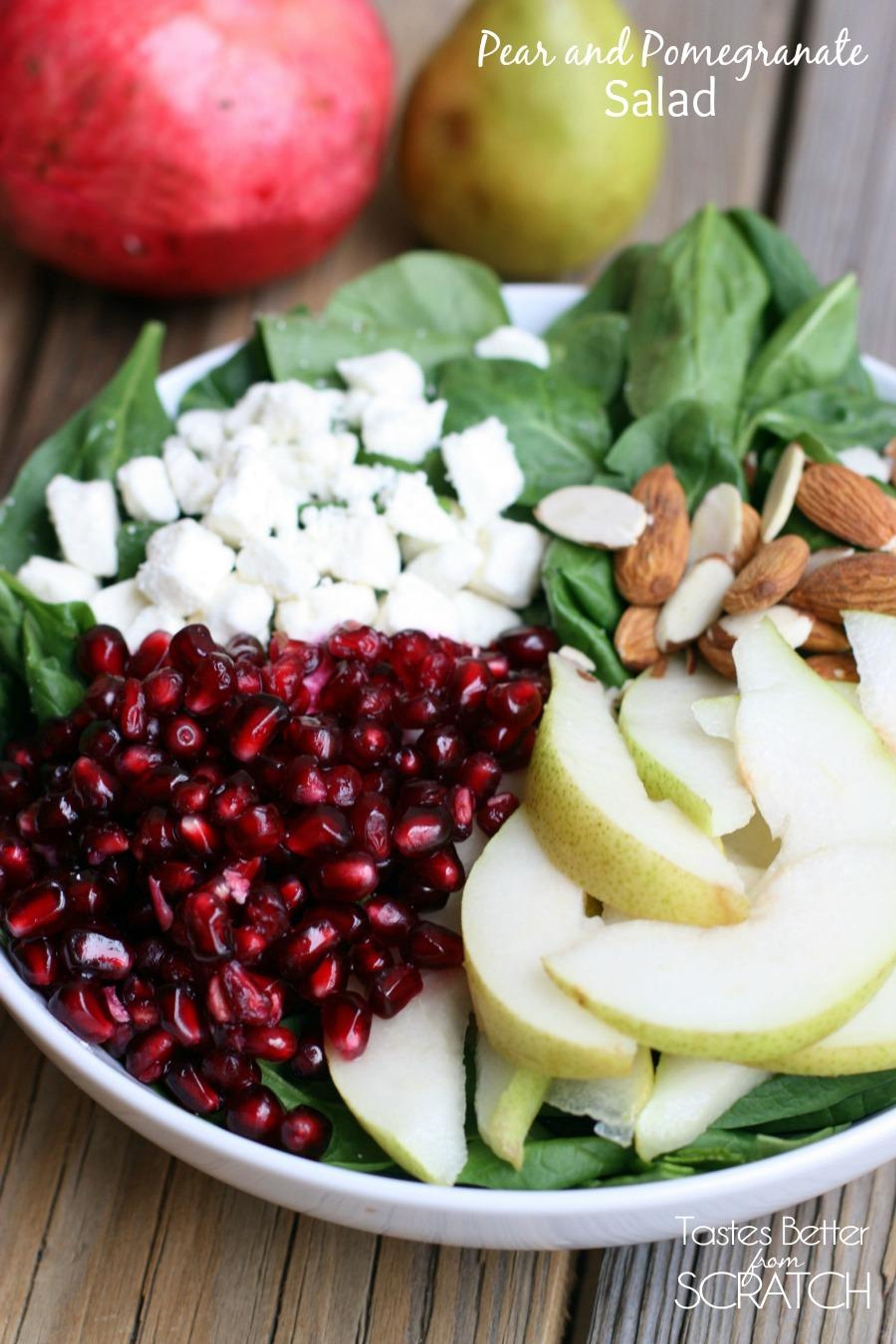 Pear and Pomegranate Salad perfect for the holidays -- with Feta Cheese, Nuts, and a Champagne Vinaigrette