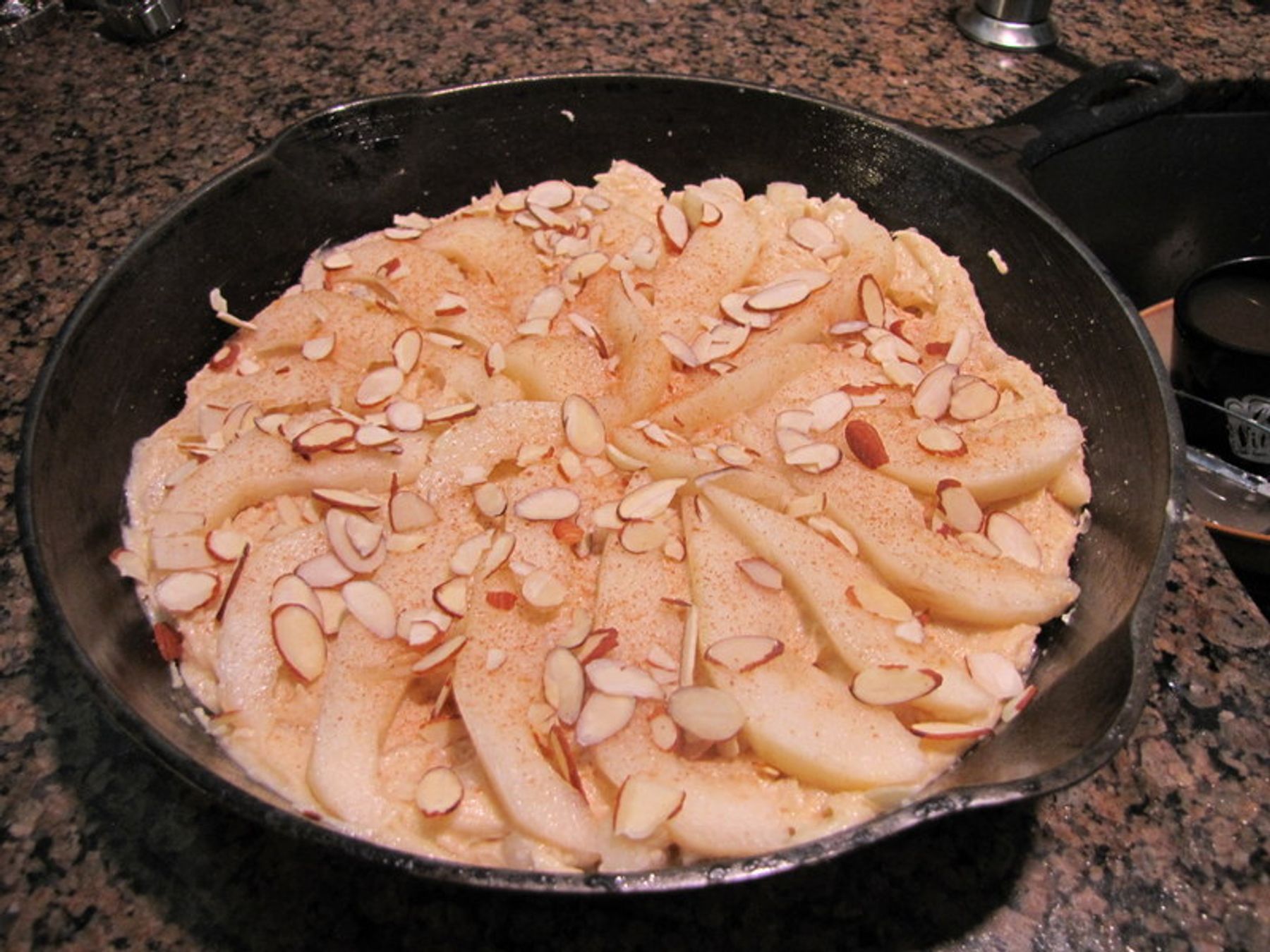 Pour the batter into the prepared skillet and spread it in an even layer. Arrange the pear slices on top of the batter and sprinkle with the sliced almonds.