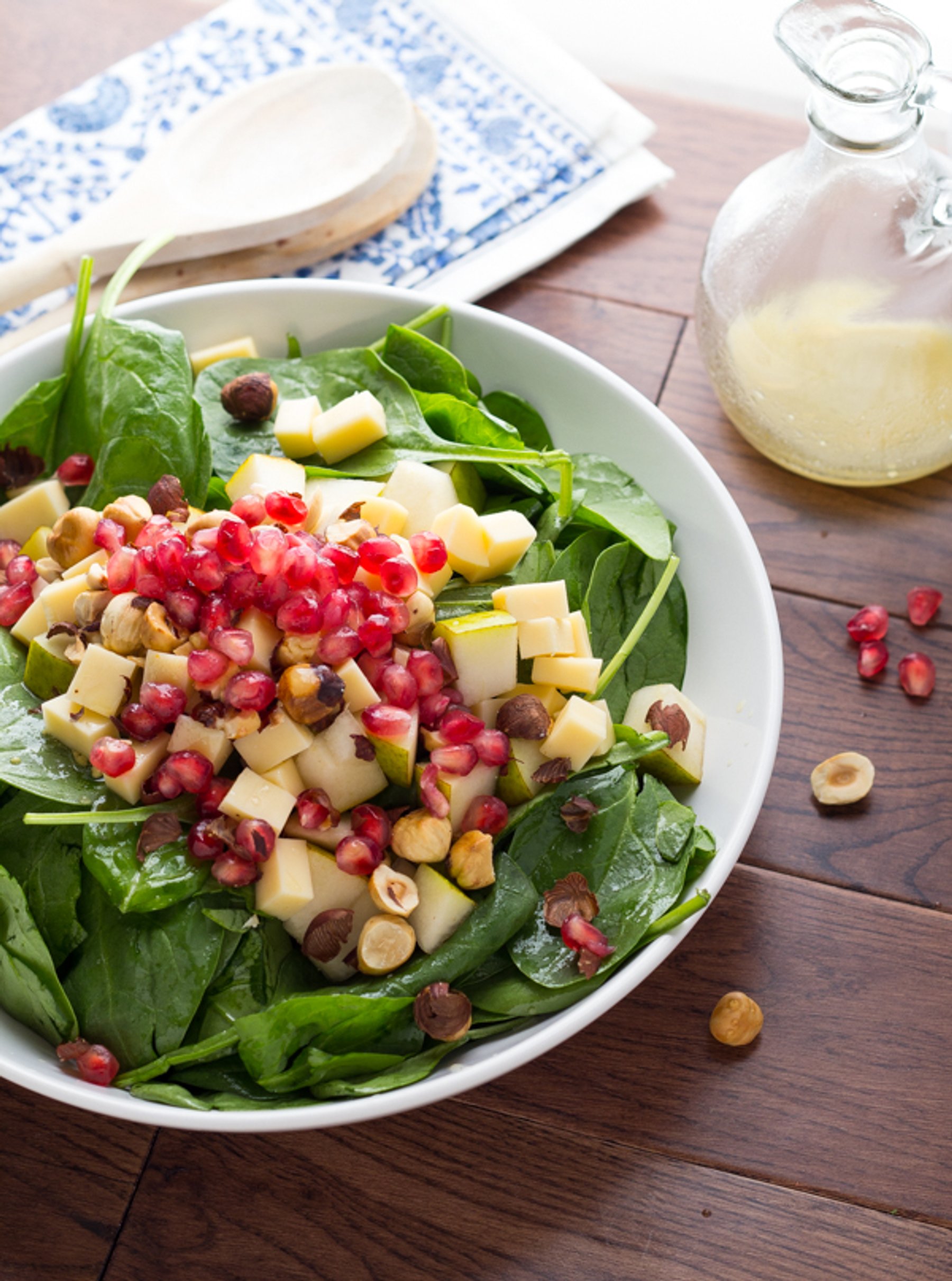 A delicious spinach salad that combines pear, Gouda, toasted hazelnuts and pomegranate seeds, tossed in a tangy vinaigrette