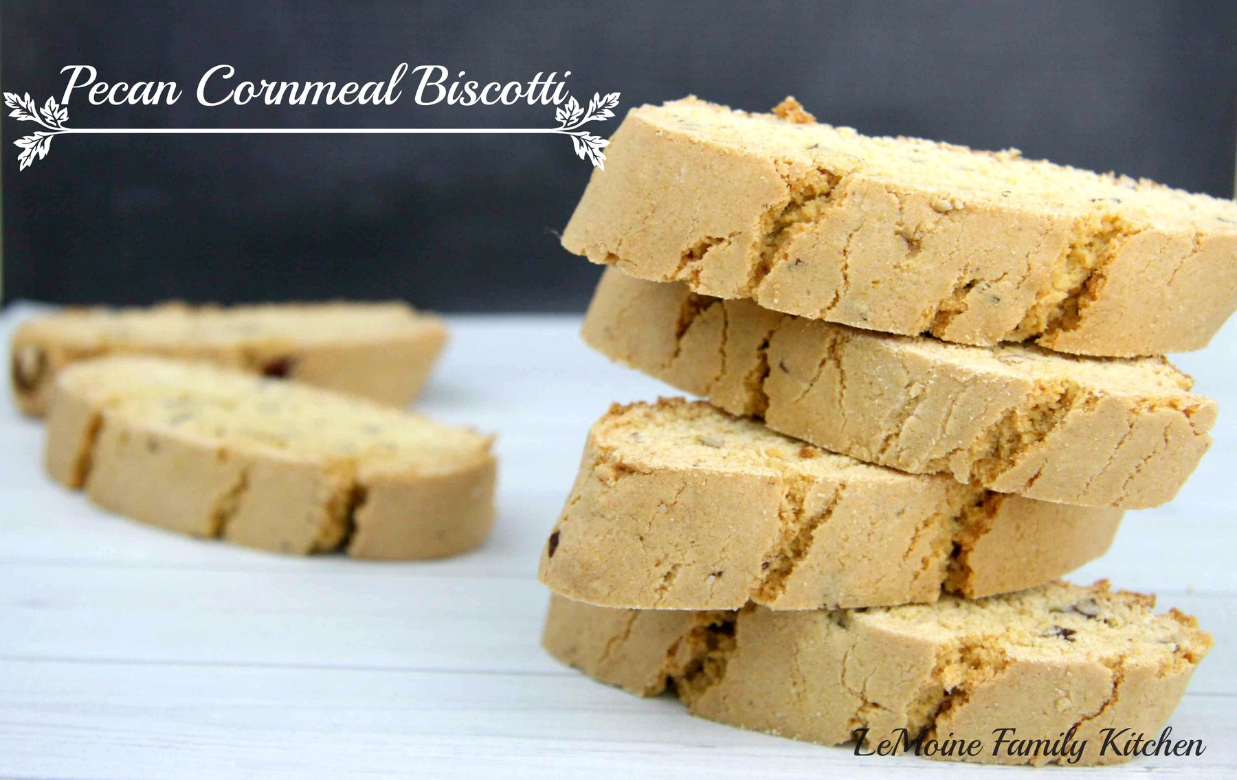 I absolutely love sitting down with a hot cup of coffee and a good biscotti. I makes me think of two things… being in Italy and spending time with my Grandma. These are a little different then a typical biscotti, these are my Pecan Cornmeal Biscotti! I really love using cornmeal, it adds to the texture and gives you a slightly nutty flavor. Pecans, they are one of my favorite nuts to use in baking. They add great crunch here.