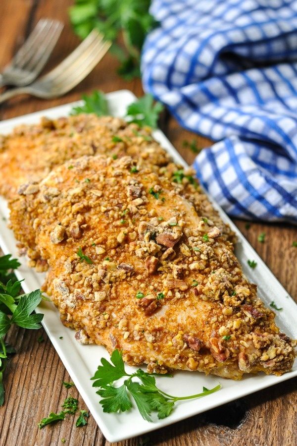 Serve a plate of baked Pecan Crusted Chicken for a flavorful, easy dinner that's ready for the oven in just 15 minutes! The chicken breasts are coated in crunchy toasted pecans so that they're crispy on the outside, but tender and juicy on the inside.