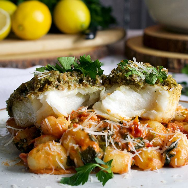 Halibut steaks are pan seared, covered with a pecan and parmesan crust, roasted until tender and flaky, and served over creamy sun dried tomato and spinach gnocchi.