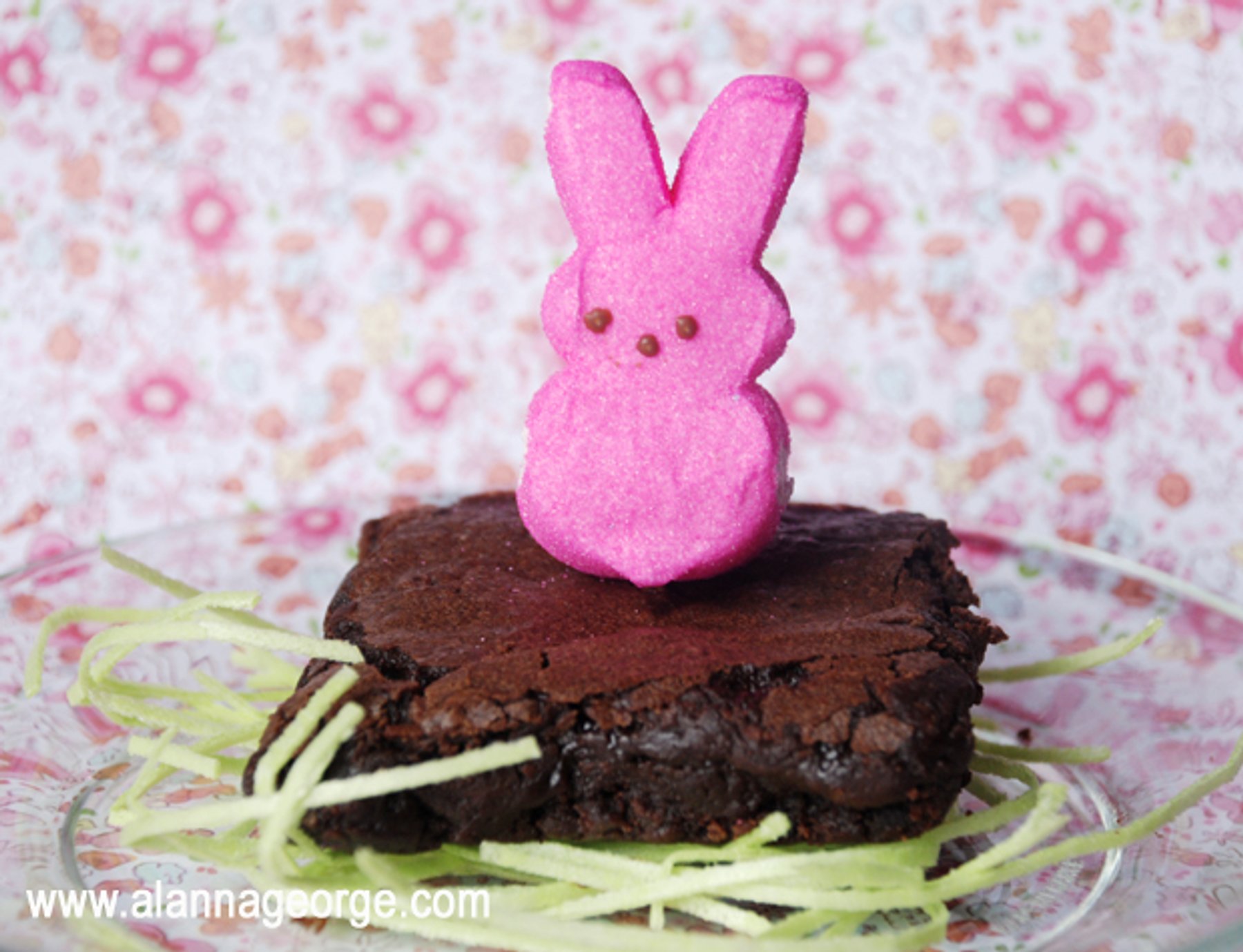 This is the treat my daughter took to school to hand out on her birthday. Homemade brownies layered on top of edible Easter grass and topped off with a bunny Peep on a toothpick.