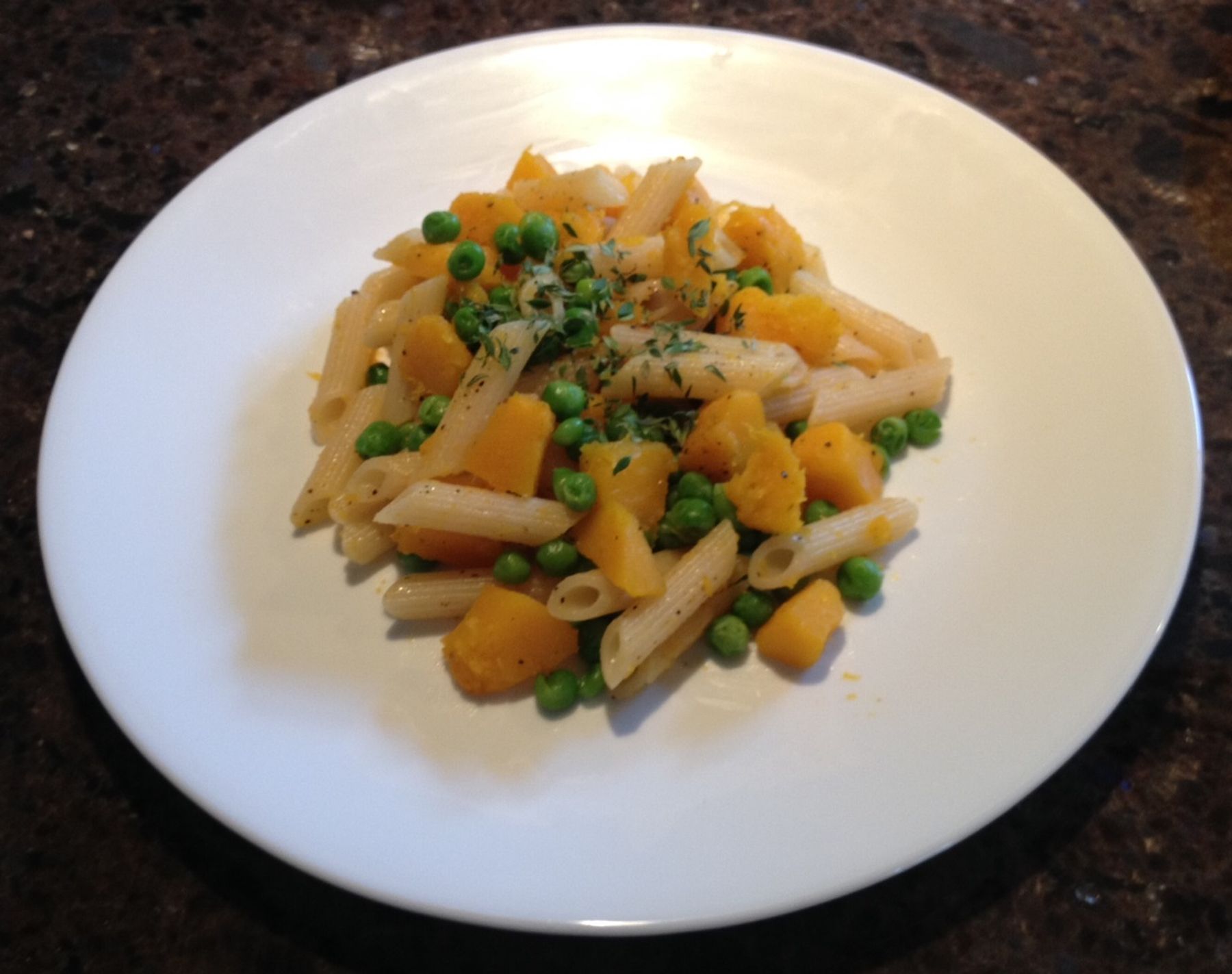 Heat olive oil in a pan, add pumpkin, peas, and thyme. Cook for about 3 minutes.