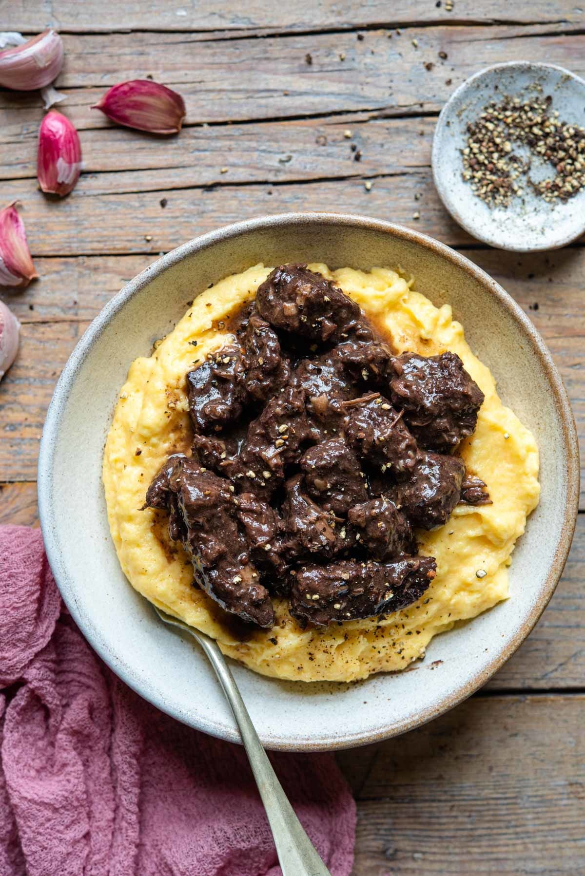 Peposo is a traditional Tuscan Beef Stew originating from Florence. It truly is the simplest stew you'll ever make yet it has so much flavour. Made with garlic, lots of black pepper and a whole bottle of red wine, super delicious and perfect served with creamy polenta.