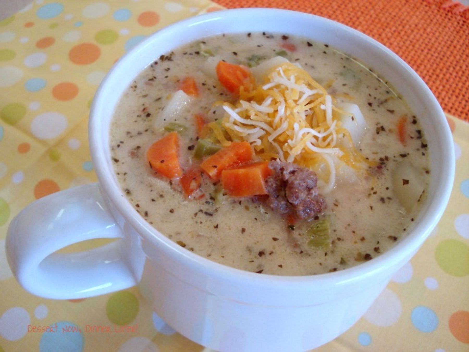 Tender potatoes, carrots, celery & onion amidst a cheesy & creamy broth with chunks of ground beef make this soup hearty & delicious with that kick from the pepper-jack cheese.
