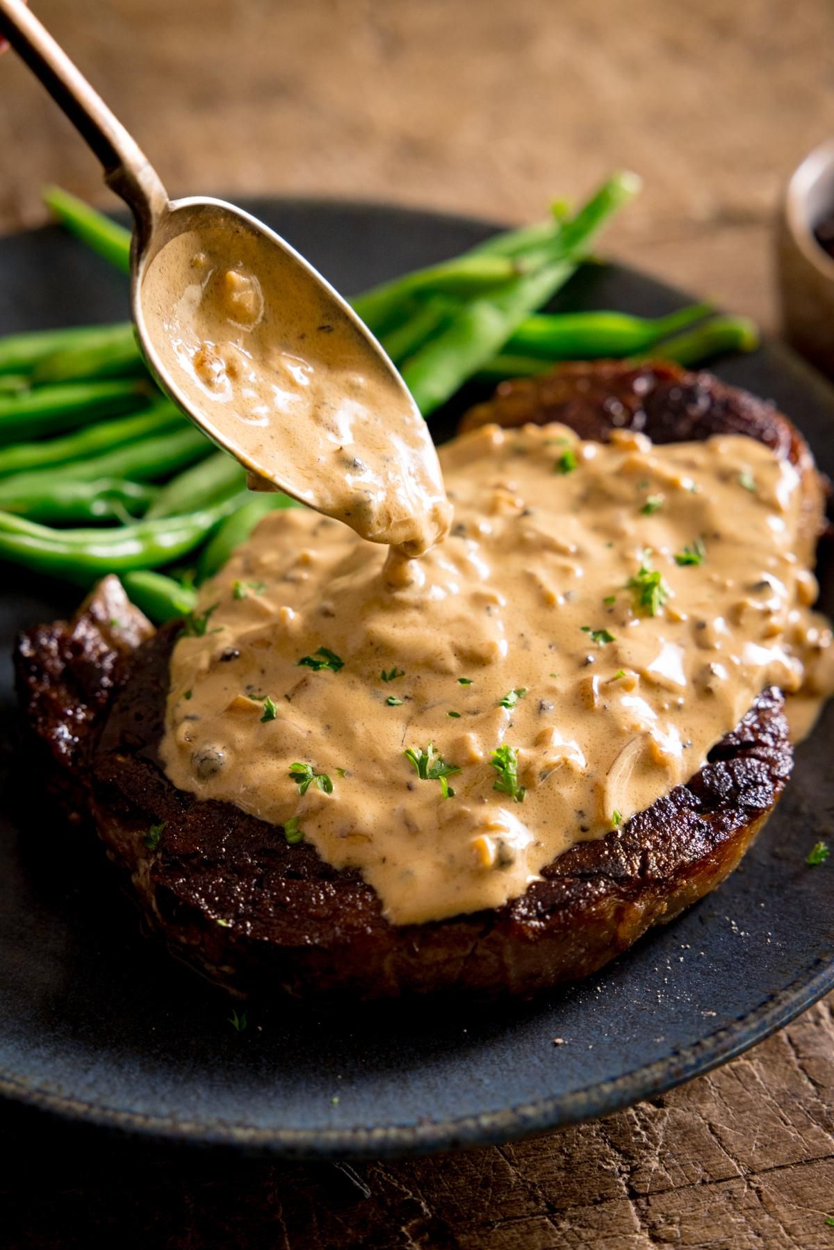 Peppercorn Sauce Nicky CorbishleySeptember 29, 2021 53 Kitchen SanctuaryCreamy peppercorn sauce has a lovely rich warmth to it that goes so well with a juicy steak. Ready in 10 minutes!Peppercorn SauceSee the full directions on my site
