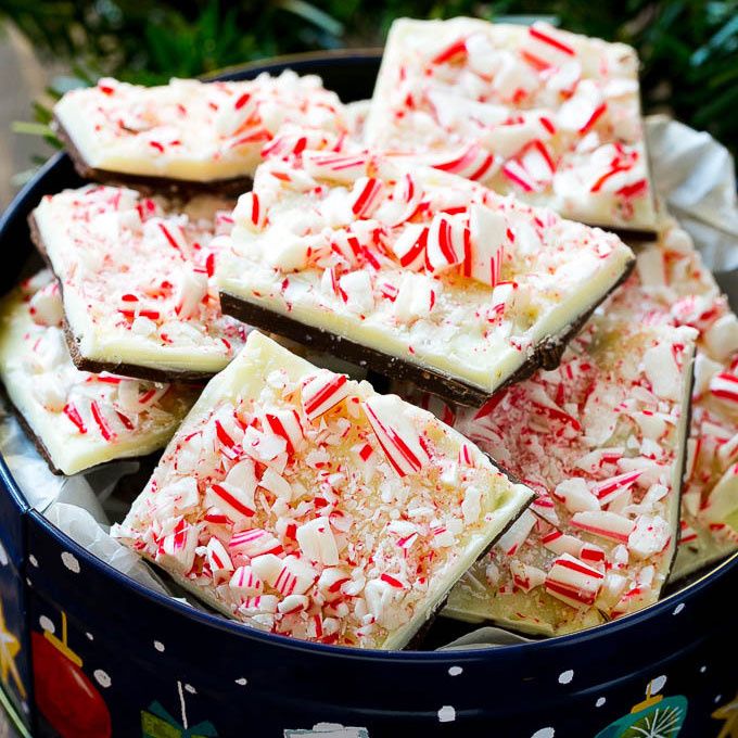 This recipe for classic peppermint bark is layers of white and dark chocolate topped with crushed candy canes. A holiday favorite that's quick to make and perfect for parties and gift giving.