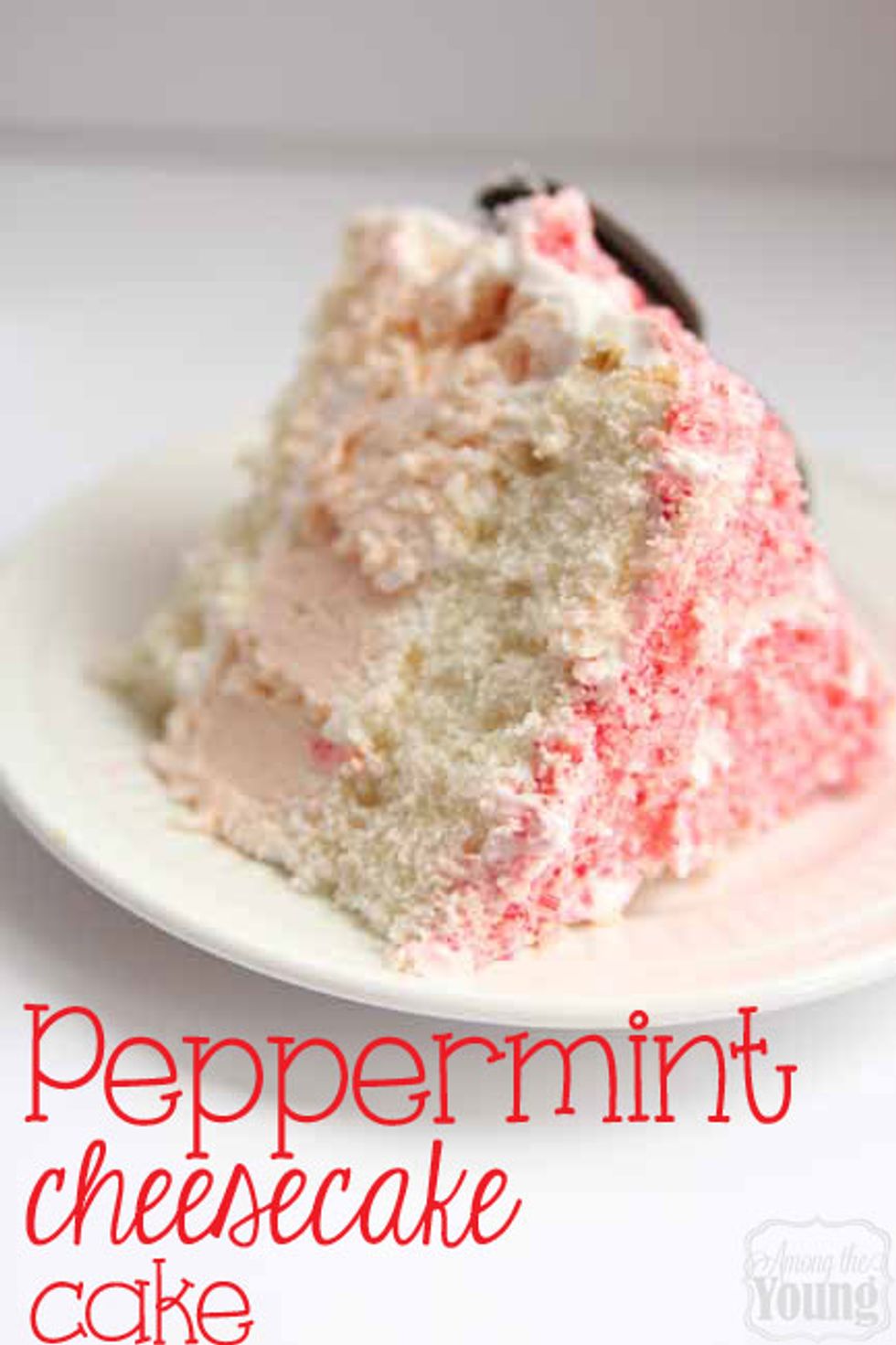 Peppermint cheesecake sandwiched between two layers of white cake. YUM.