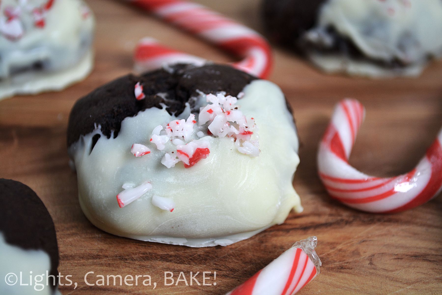 Chocolate cookies with a few white chocolate chips and crushed candy canes thrown in and then dipped in melted white chocolate.