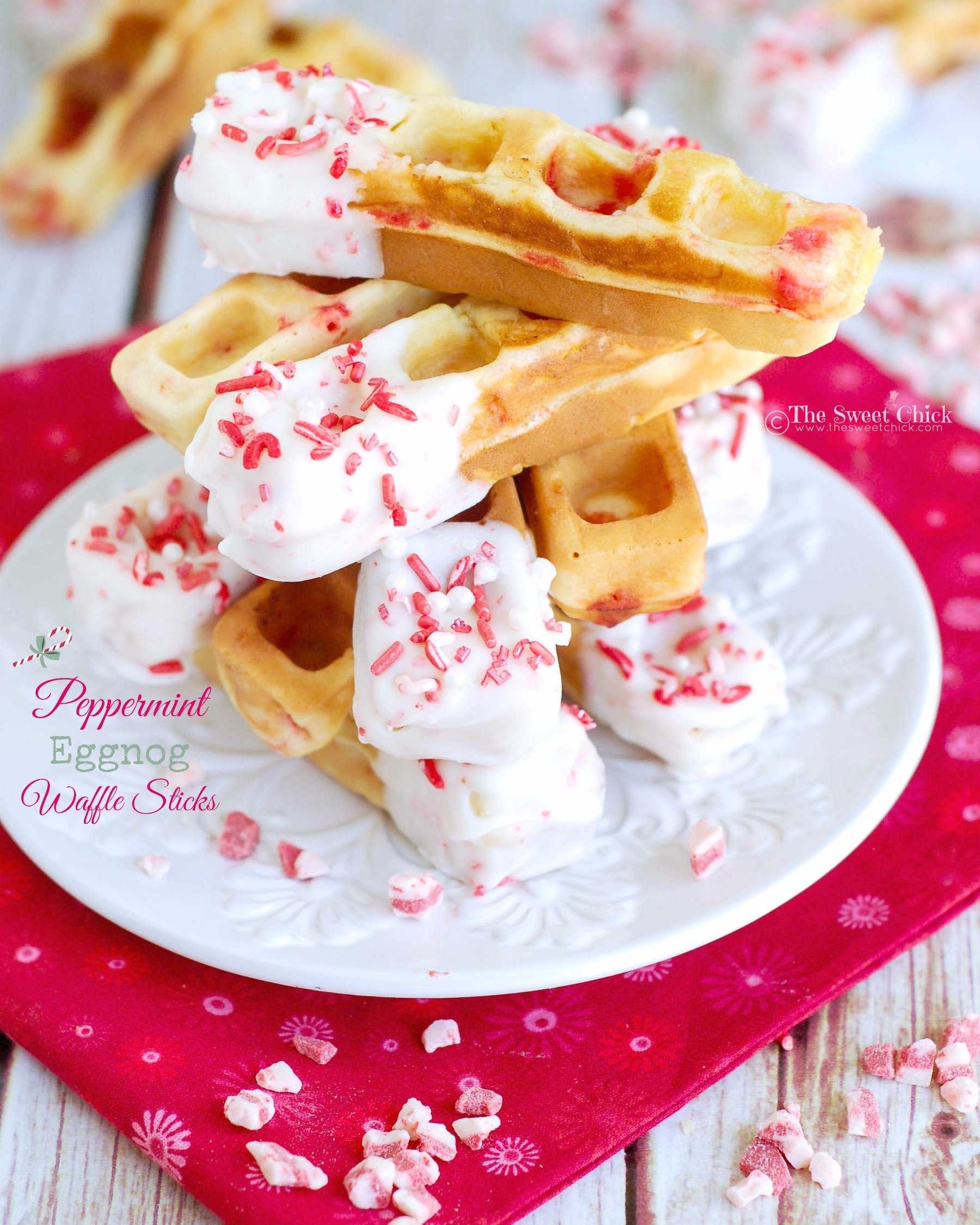Waffles made with eggnog and peppermint baking chips, then dipped in candy cane flavored candy melt.