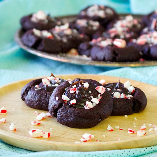 These simple little chocolate thumbprint cookies are filled with a dollop of peppermint spiked hot fudge and a sprinkling of crushed candy canes.