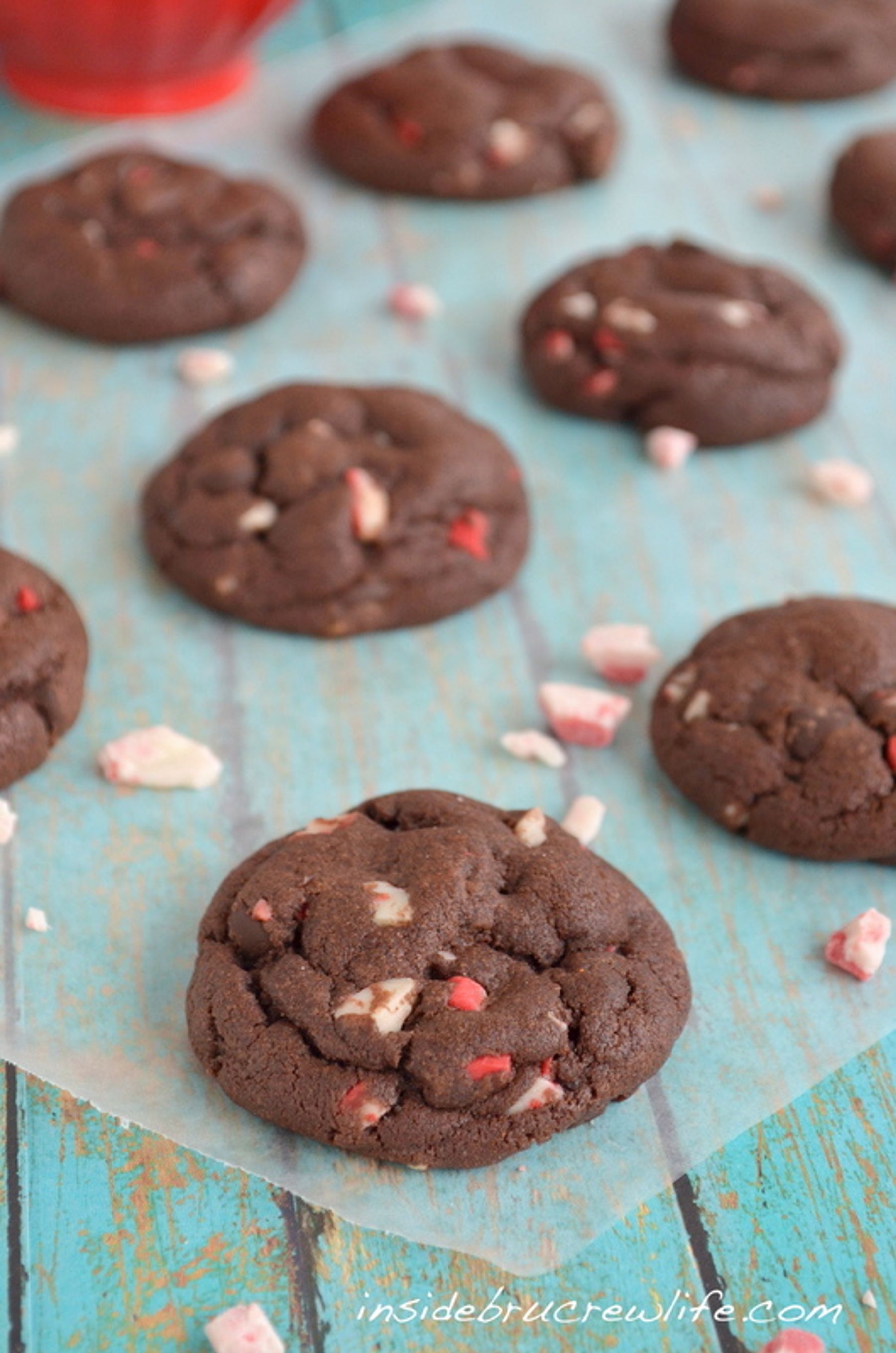 Chocolate fudge pudding cookies with mocha spread, chocolate chips, and peppermint crunch pieces.