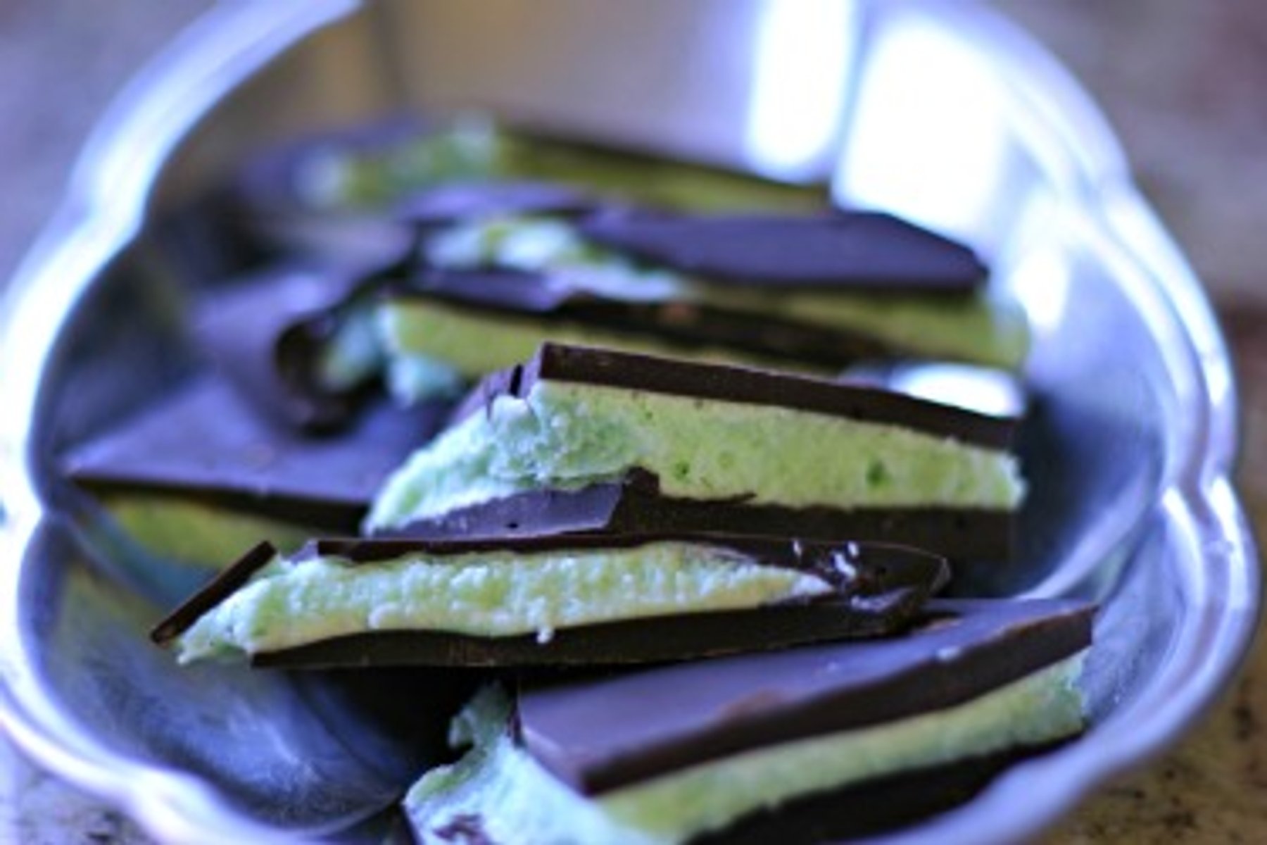 Layered chocolate bark with dark chocolate held together by a creamy, mint center. Just like you favored peppermint chocolate candy!