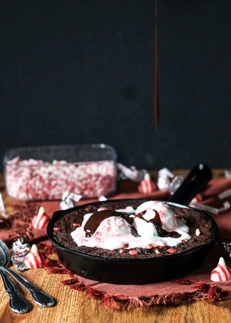 This Peppermint Skillet Brownie, loaded with chocolate, peppermint chips, & Candy Cane Kisses, is the perfect decadent treat to share!
