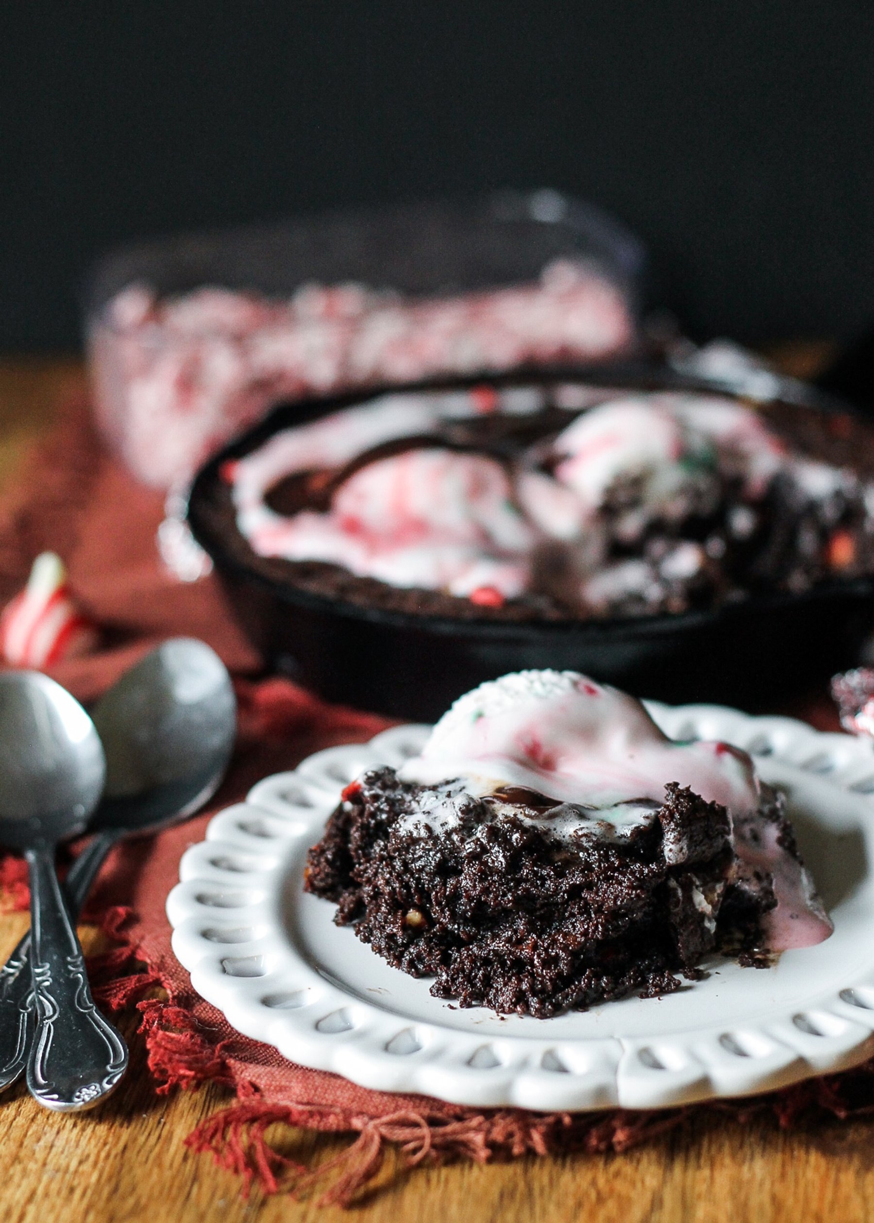 This Peppermint Skillet Brownie, loaded with chocolate, peppermint chips, & Candy Cane Kisses, is the perfect decadent treat to share!