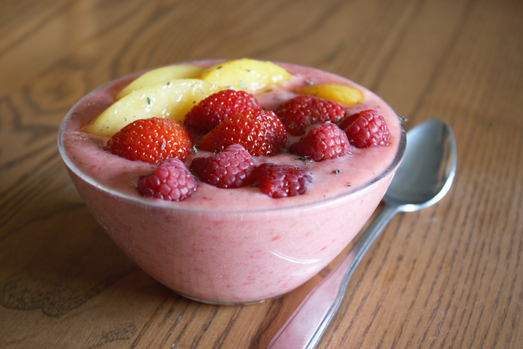 A delicious and refreshing smoothie bowl featuring peppermint tea, chock full of fresh and frozen fruit. A perfect treat for a warm spring or summer day.