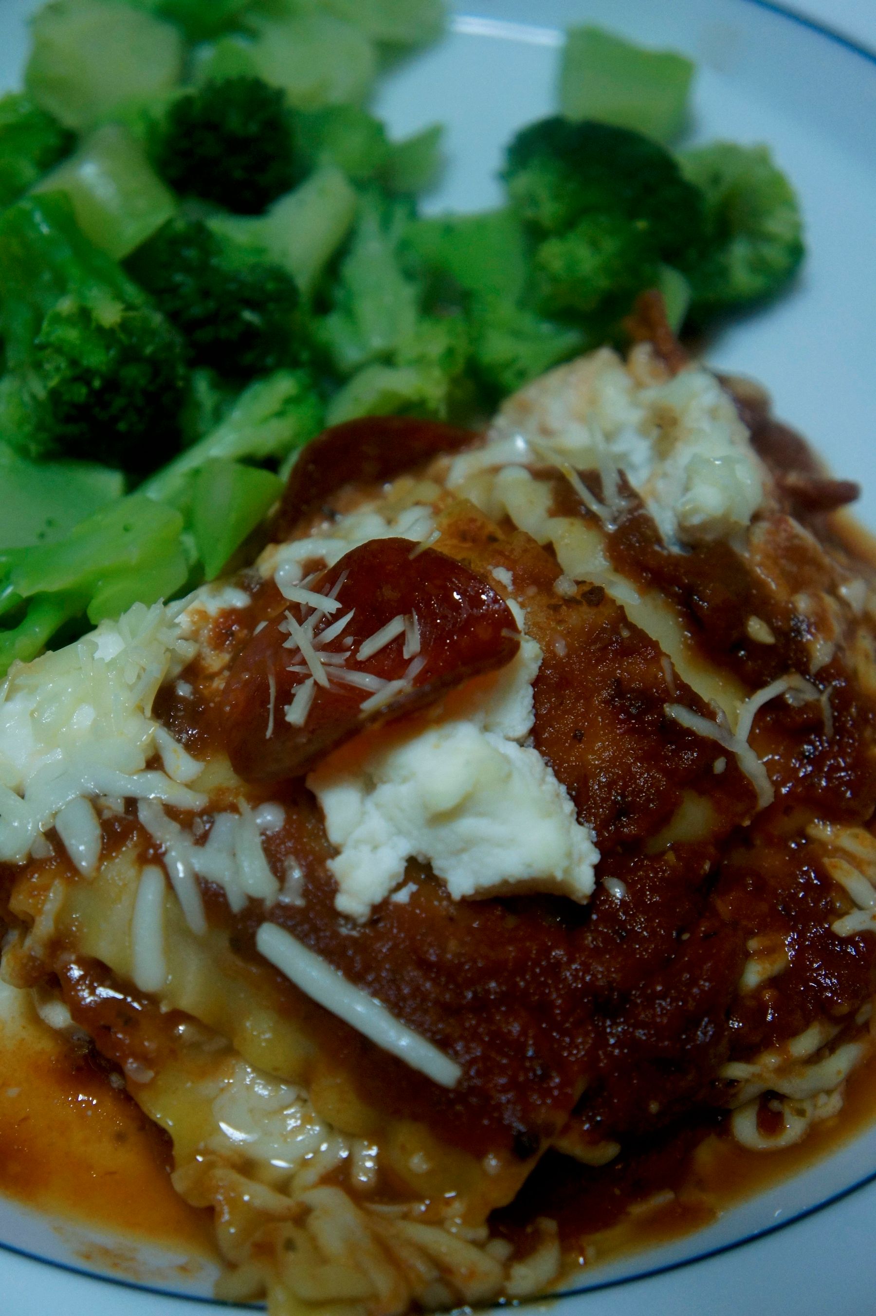 Preheat oven to 350ยบ F. Spray a 9x13 baking dish with cooking spray. Cook noodles according to package directions. Drain and rinse to cool down. Lay 1/3 of the spaghetti sauce on top of noodles, then 1/3 of the ricotta cheese, 1/3 of the mozzarella cheese and 1/3 of the pepperoni. Repeat layer 2 more times making 3 layers. Sprinkle with Parmesan cheese. Bake for 30 minutes.