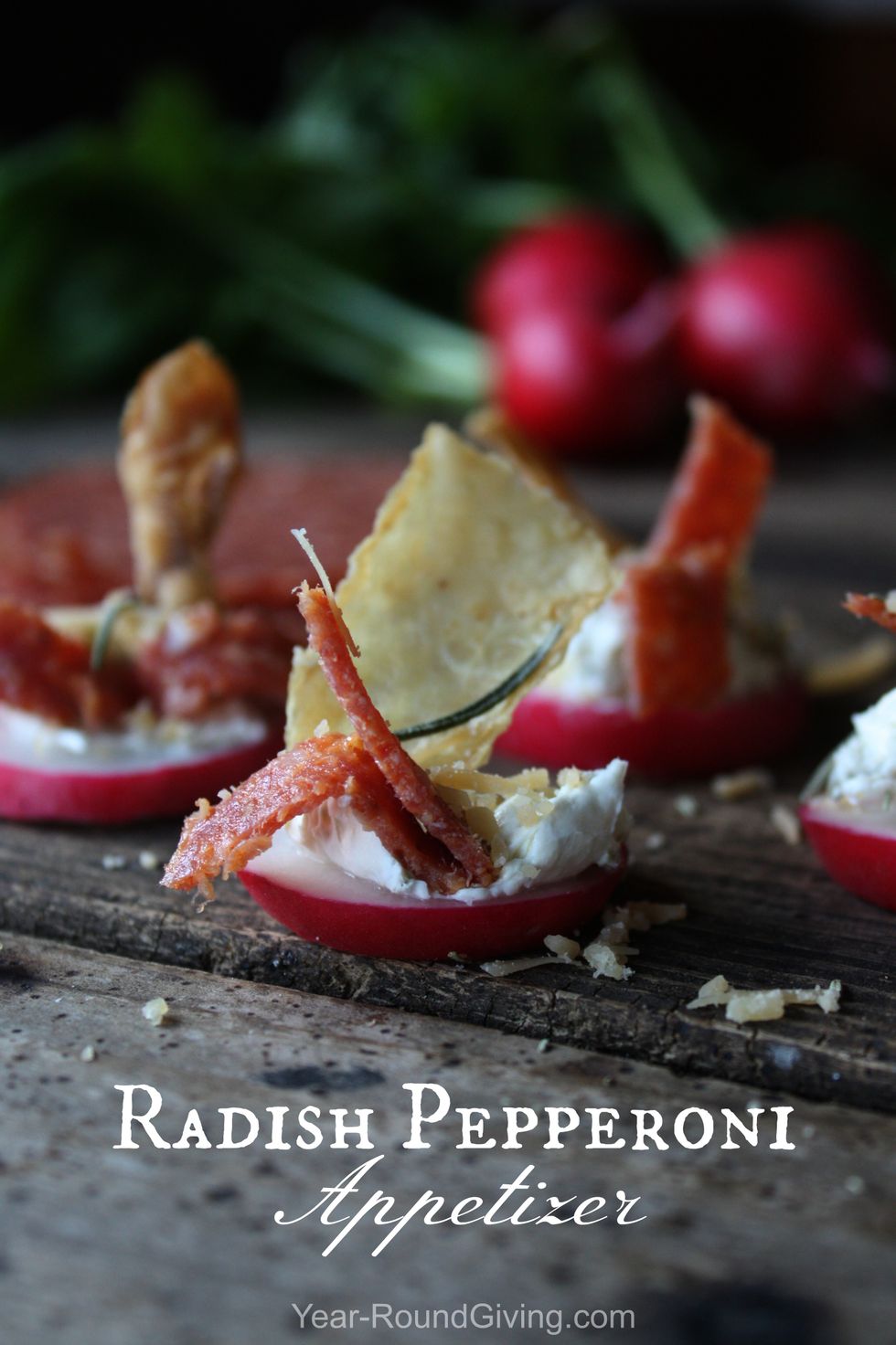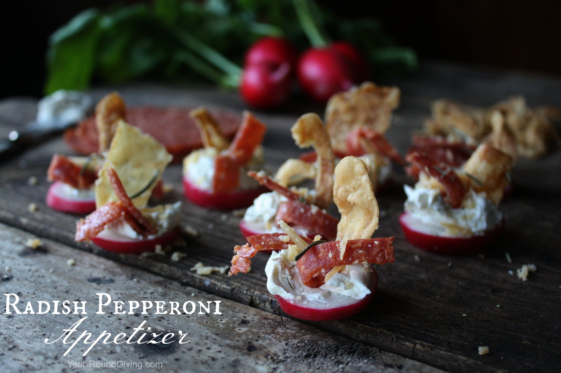 All the ingredients works so well together in this recipe. The radish and the fried onions provide the crunch. The pepperoni, fresh grated Parmesan-Reggiano cheese, and rosemary add a savory bite. Finally the creamy onion & chive cream cheese holds it all together.
