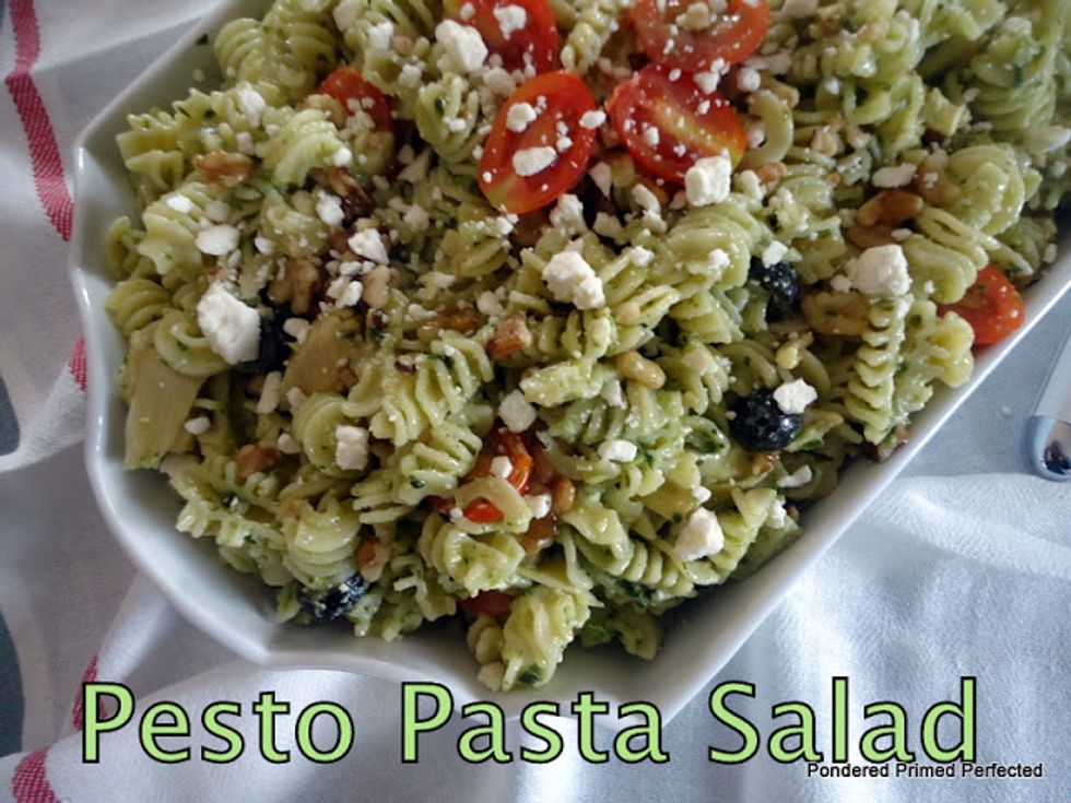 A pesto pasta salad with artichoke hearts, olives, crumbled feta cheese, cherry tomatoes, and walnuts. Perfect for potlucks and parties or as a delicious side dish. Always a crowd pleaser! Isn't it time you brought something a little more exciting than macaroni or potato salad? Can easily be made into a main course meal by adding a protein such as grilled chicken breast strips or shrimp.