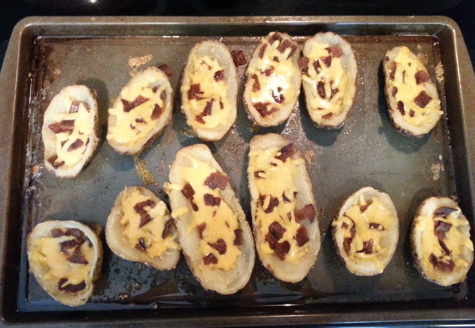Combine oil, salt, pepper, Parmesan cheese, and paprika in a small bowl. Split each potato length-wise, scoop out most of the potato and brush with oil mixture. Place open side down and bake at 475 degrees...